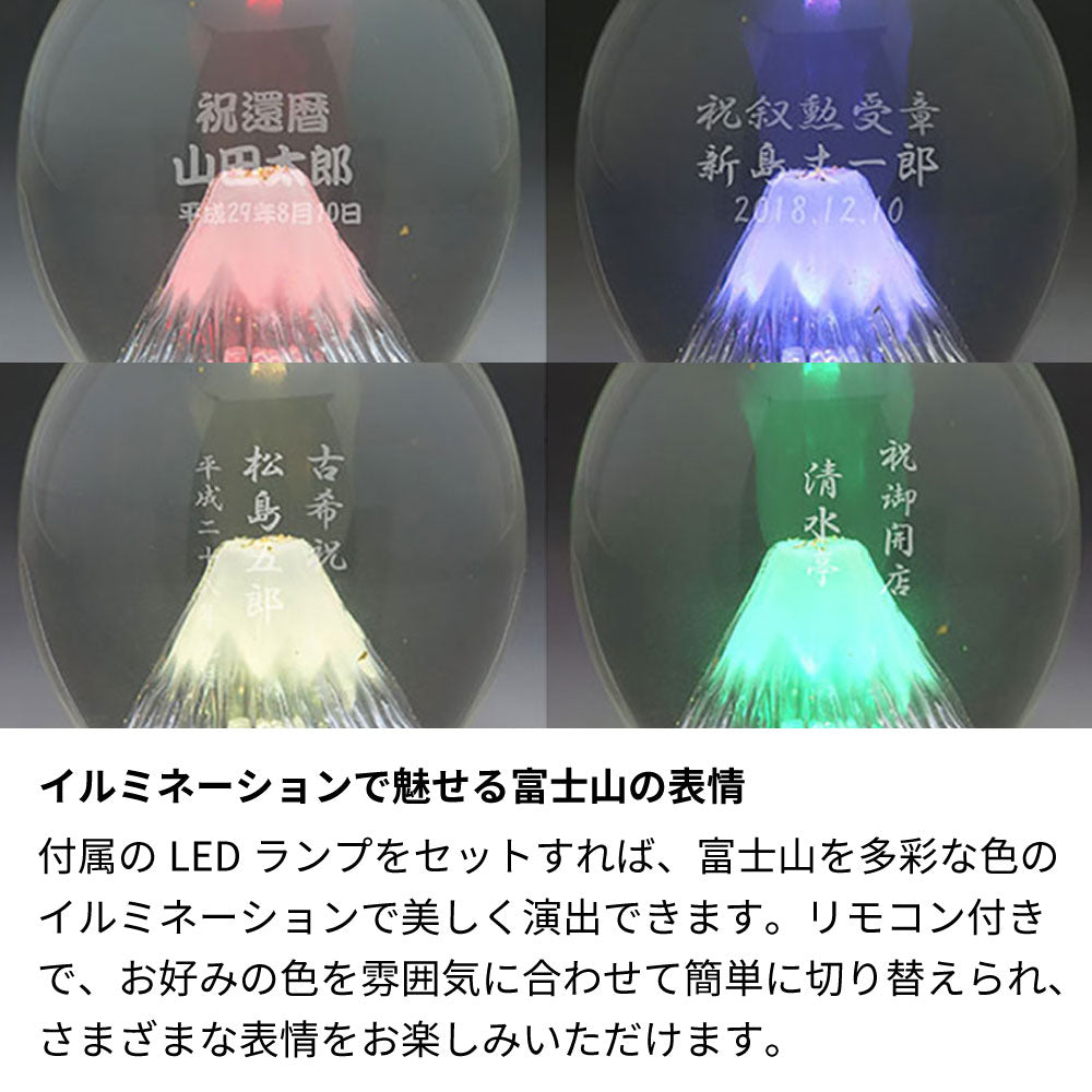 また付属のLEDランプを下に置いてイルミネーションのように色が様々に変化する富士山もお楽しみいただけます。いつまでも心に残る贈り物として最適の逸品です。