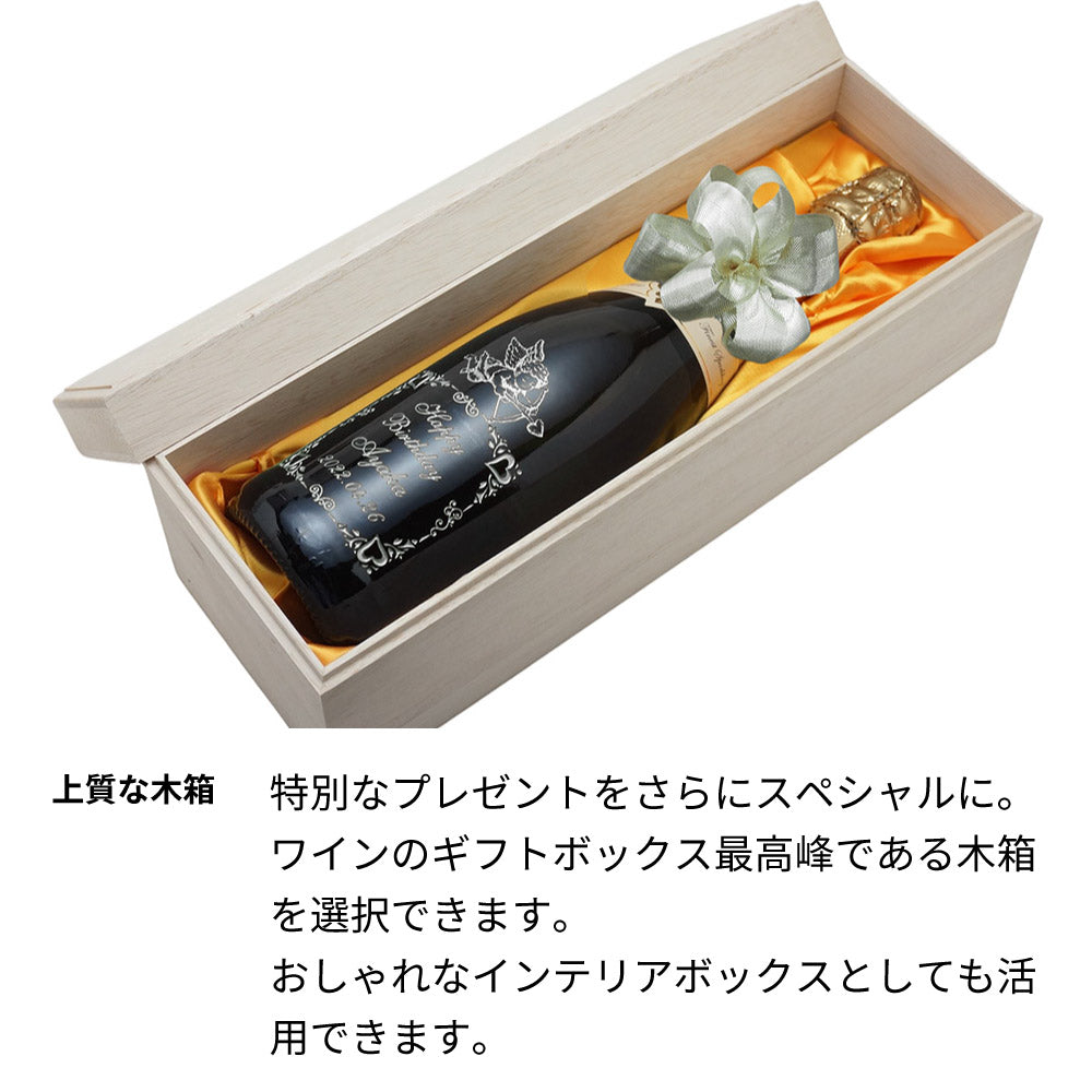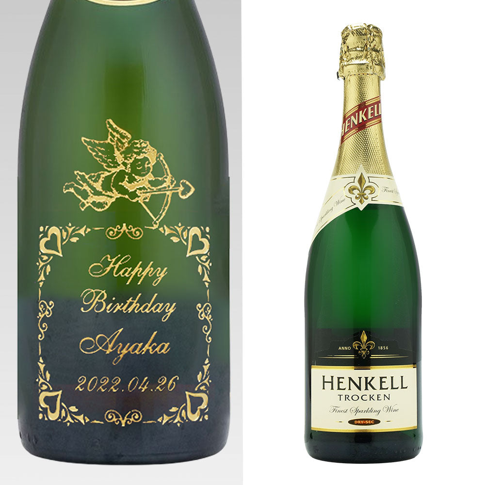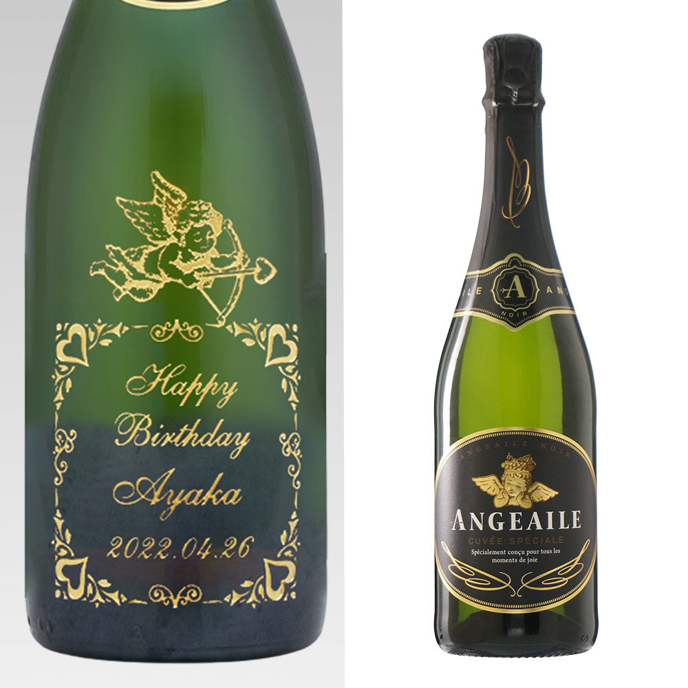 お手頃価格のスパークリングにハートとエンジェルをイメージしたデザインとメッセージ、お名前、日付などを彫刻いたします。