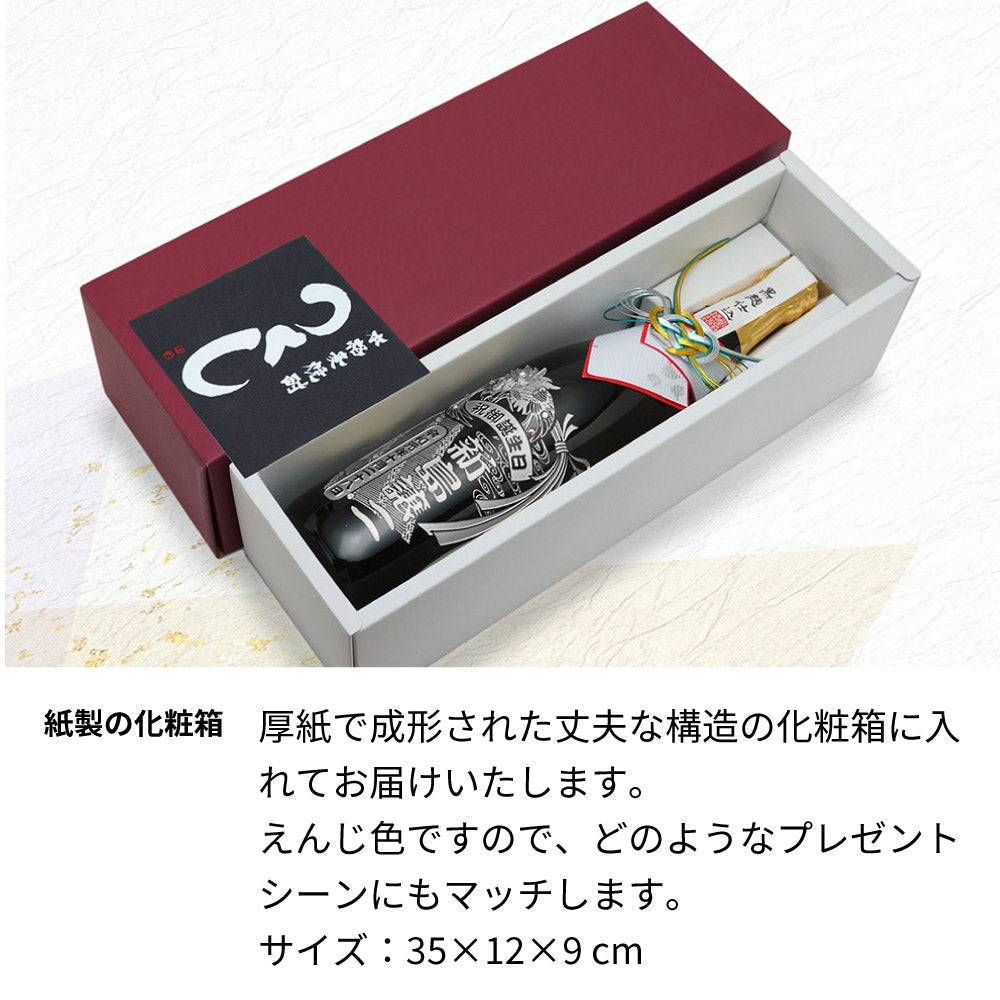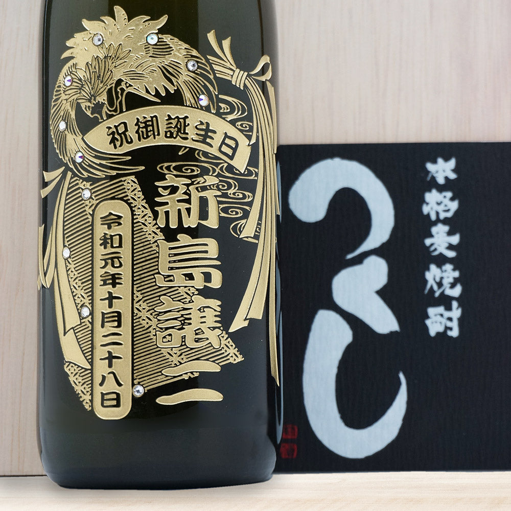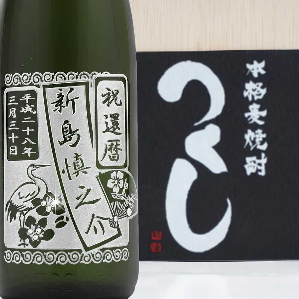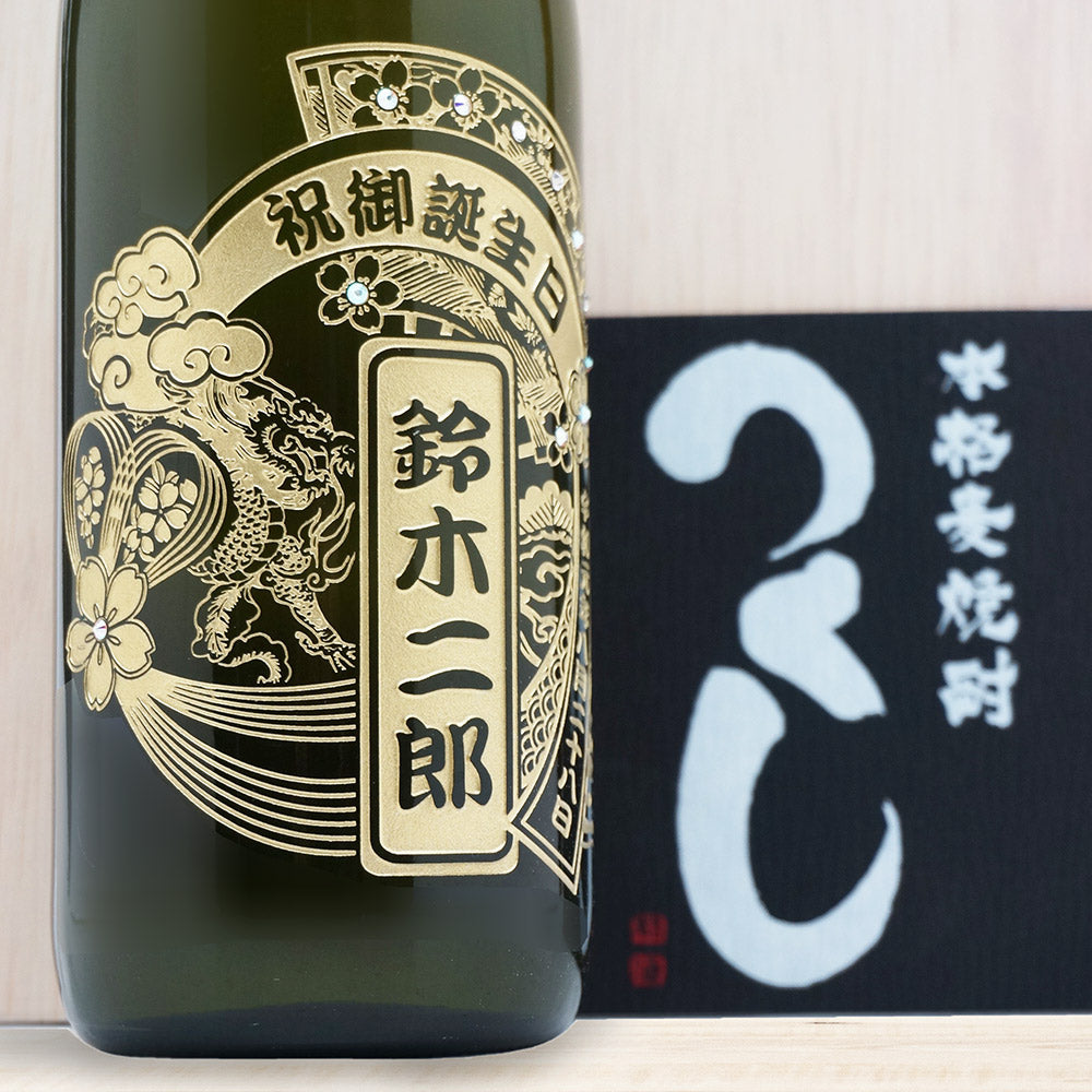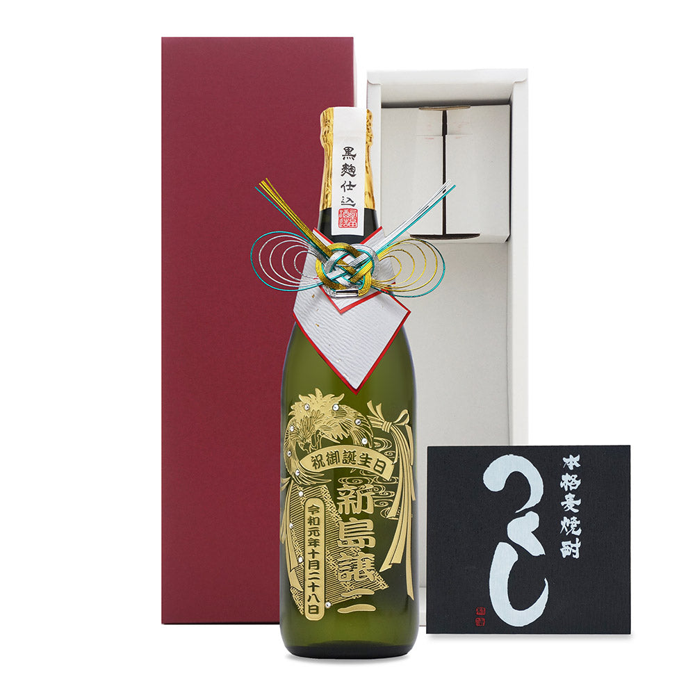 九州産の麦焼酎 「つくし」 に美しいデザイン・お名前を彫刻したオリジナルギフトです。