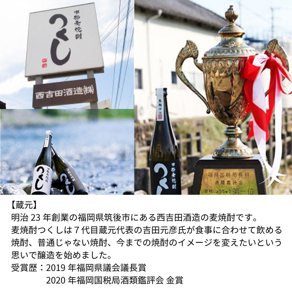 麦焼酎つくしは7代目蔵元代表の吉田元彦氏が食事に合わせて飲める焼酎、普通じゃない焼酎、今までの焼酎のイメージを変えたいという思いで醸造を始めました。