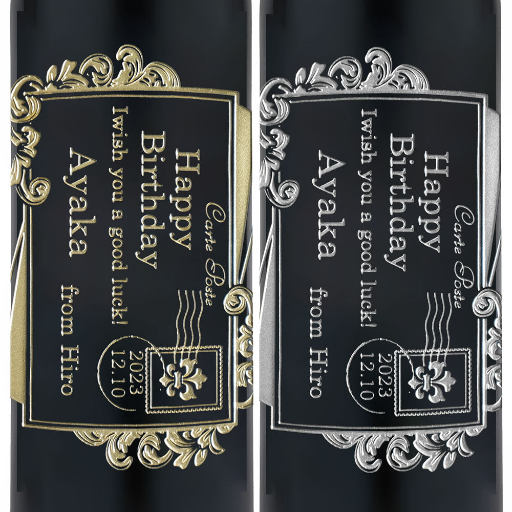 ワインボトルにポストカードやエアメールをイメージしたデザインにメッセージやお名前を彫刻してオリジナルギフトをお作りします。