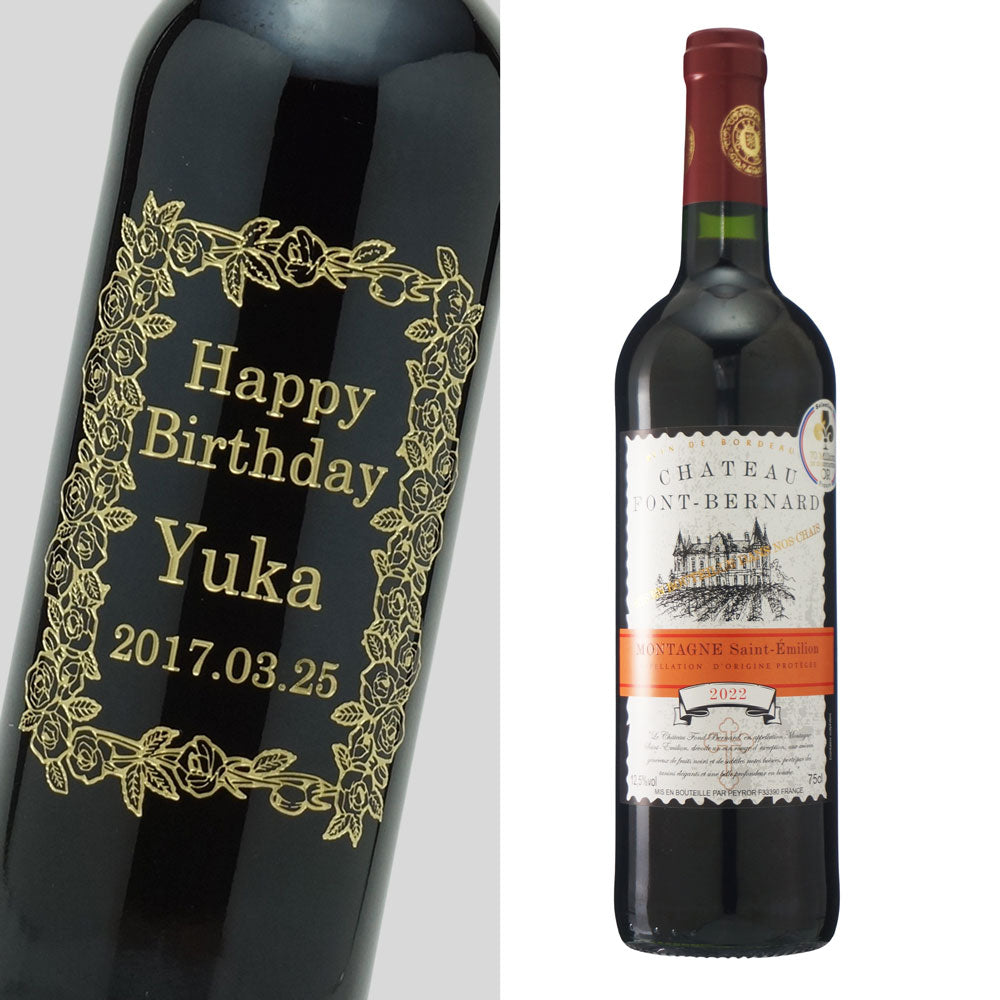 ワインボトルに、お祝いにふさわしい人気のバラのデザイン、メッセージやお名前を彫刻して、特別なオリジナルギフトをお作りします。