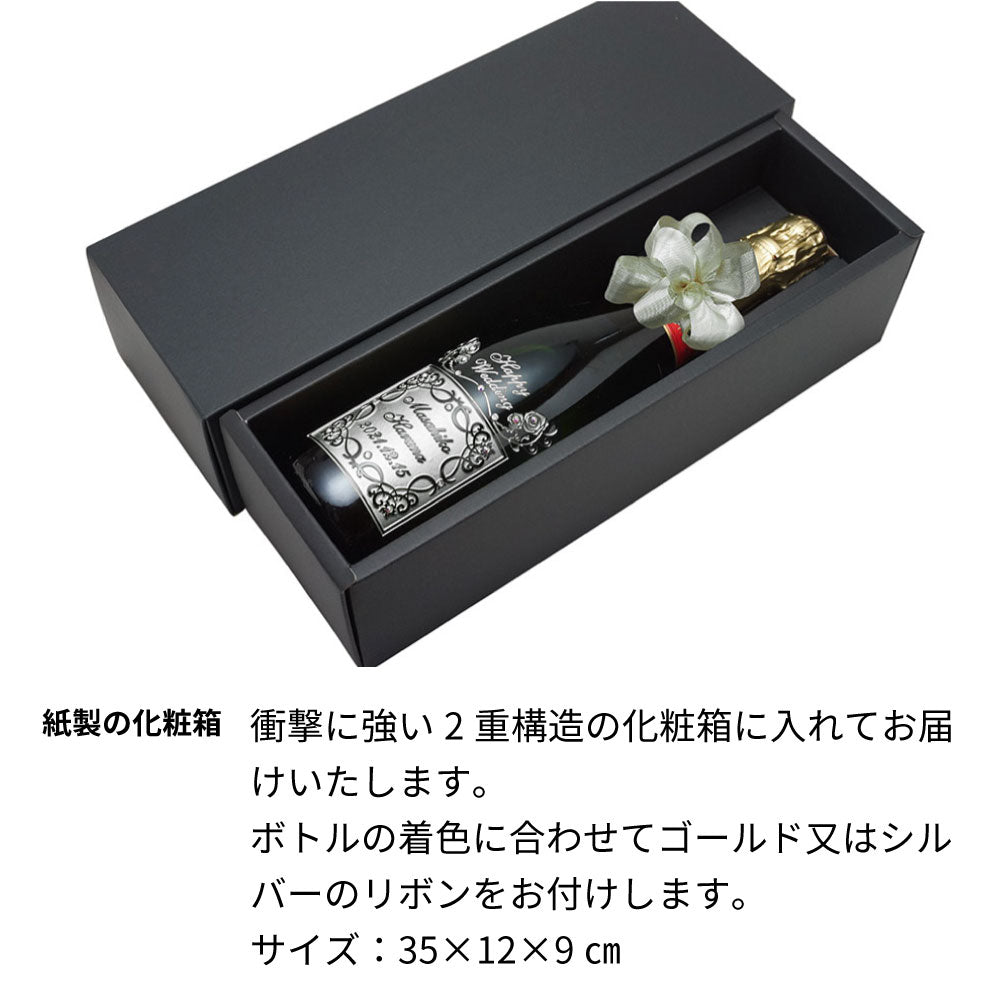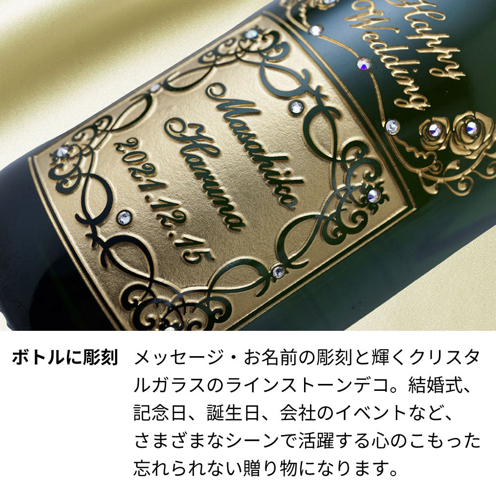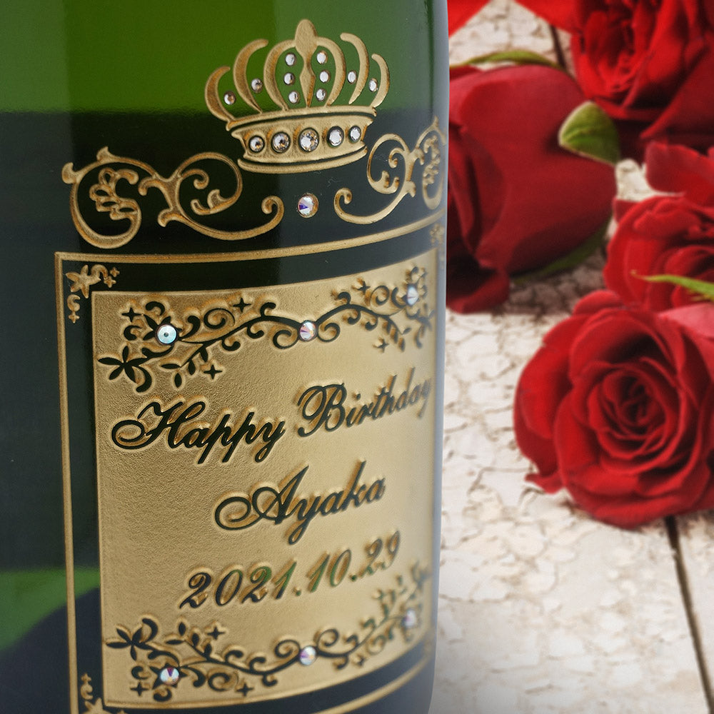 高級シャンパンに、オリジナルデザイン、名前とメッセージを彫刻、ラインストーンをデコレーションした特別な贈りものです。