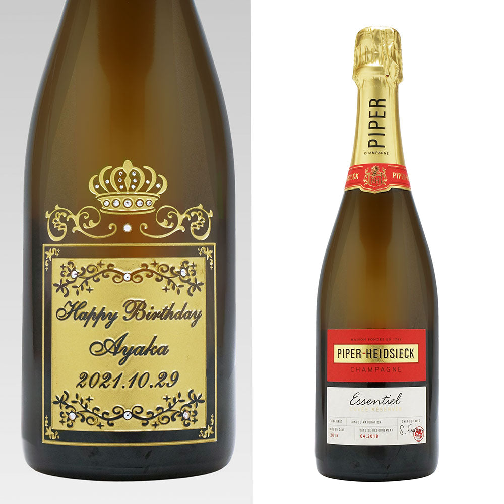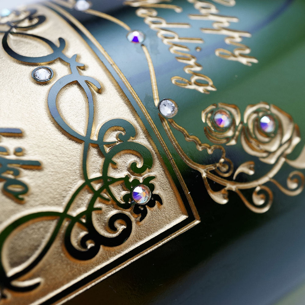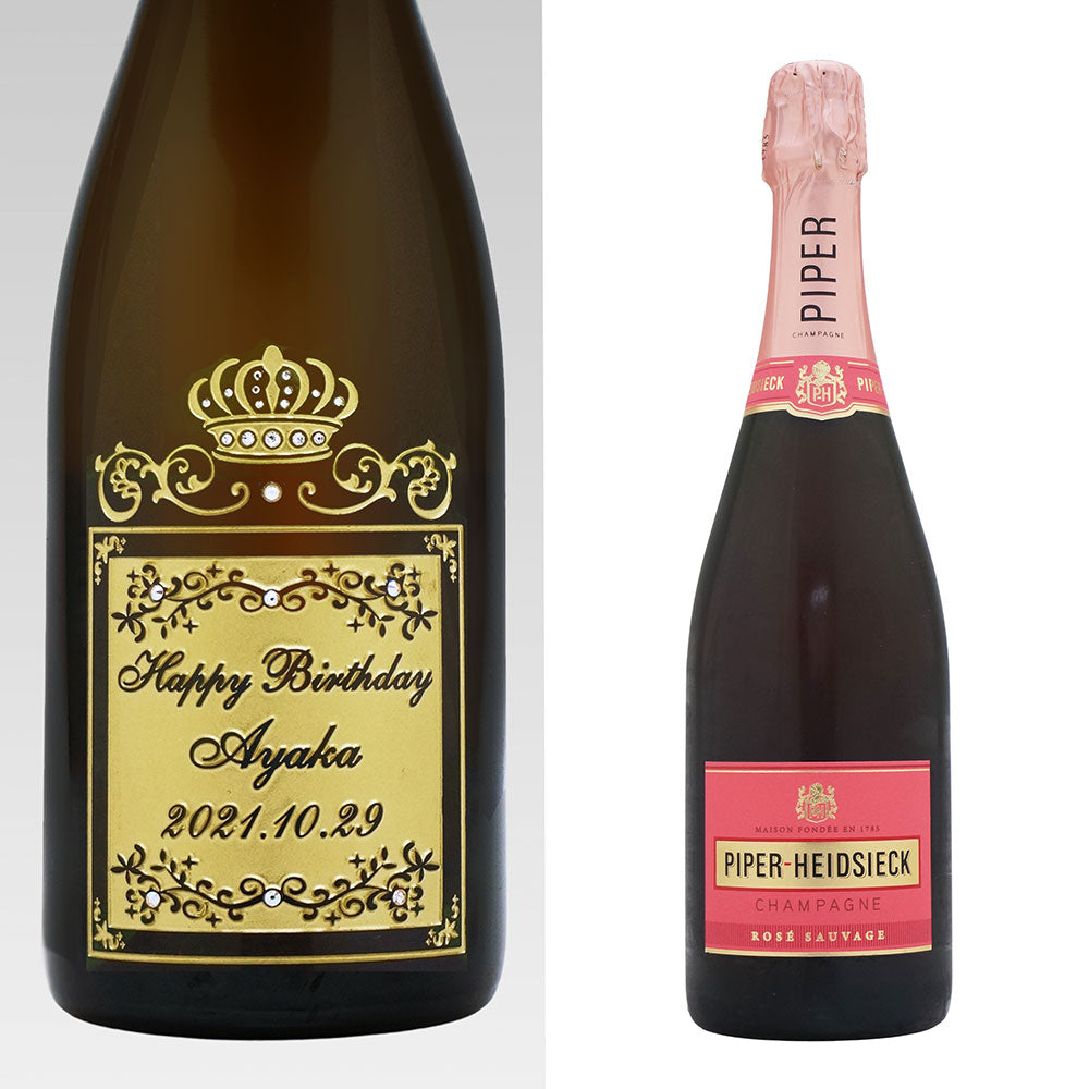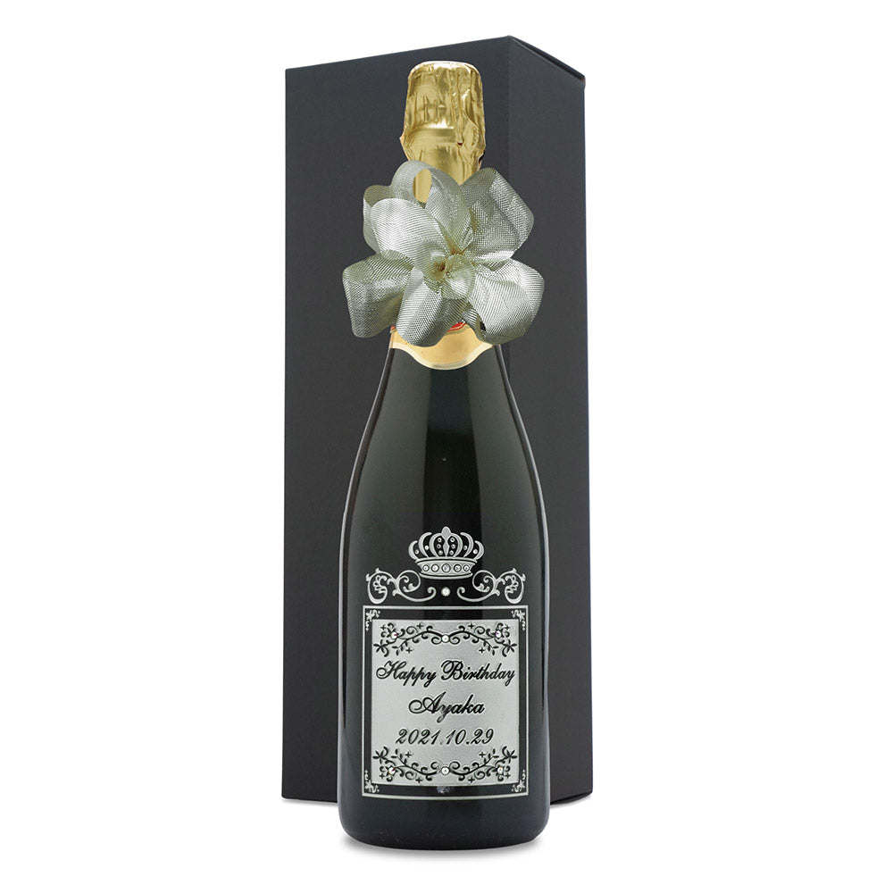 高級シャンパンに、オリジナルデザイン、名前とメッセージを彫刻、ラインストーンをデコレーションした特別な贈りものです。