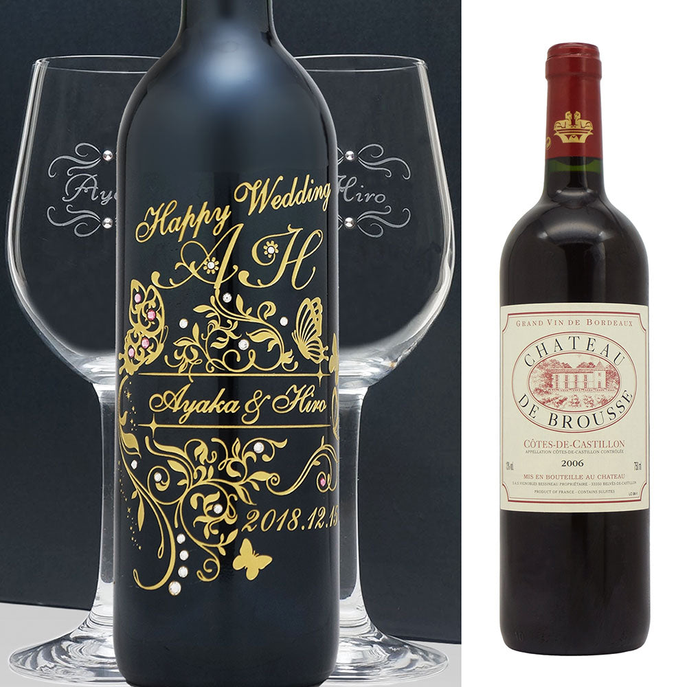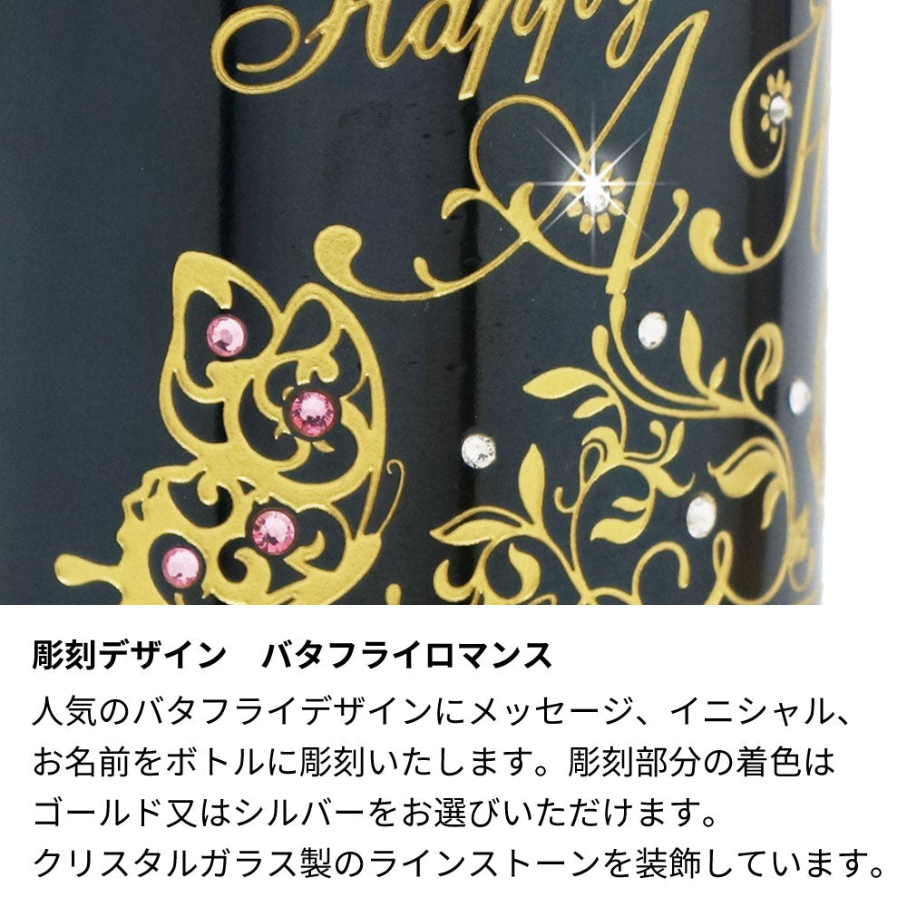 当ショップ厳選のの赤ワイン又は白ワインに、名前とイニシャル、人気のバタフライデザインを彫刻、ラインストーンをデコレーションした特別な贈りものです。
