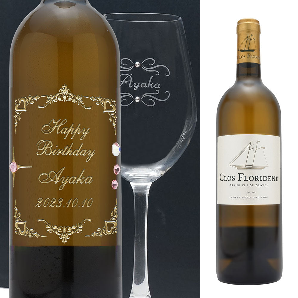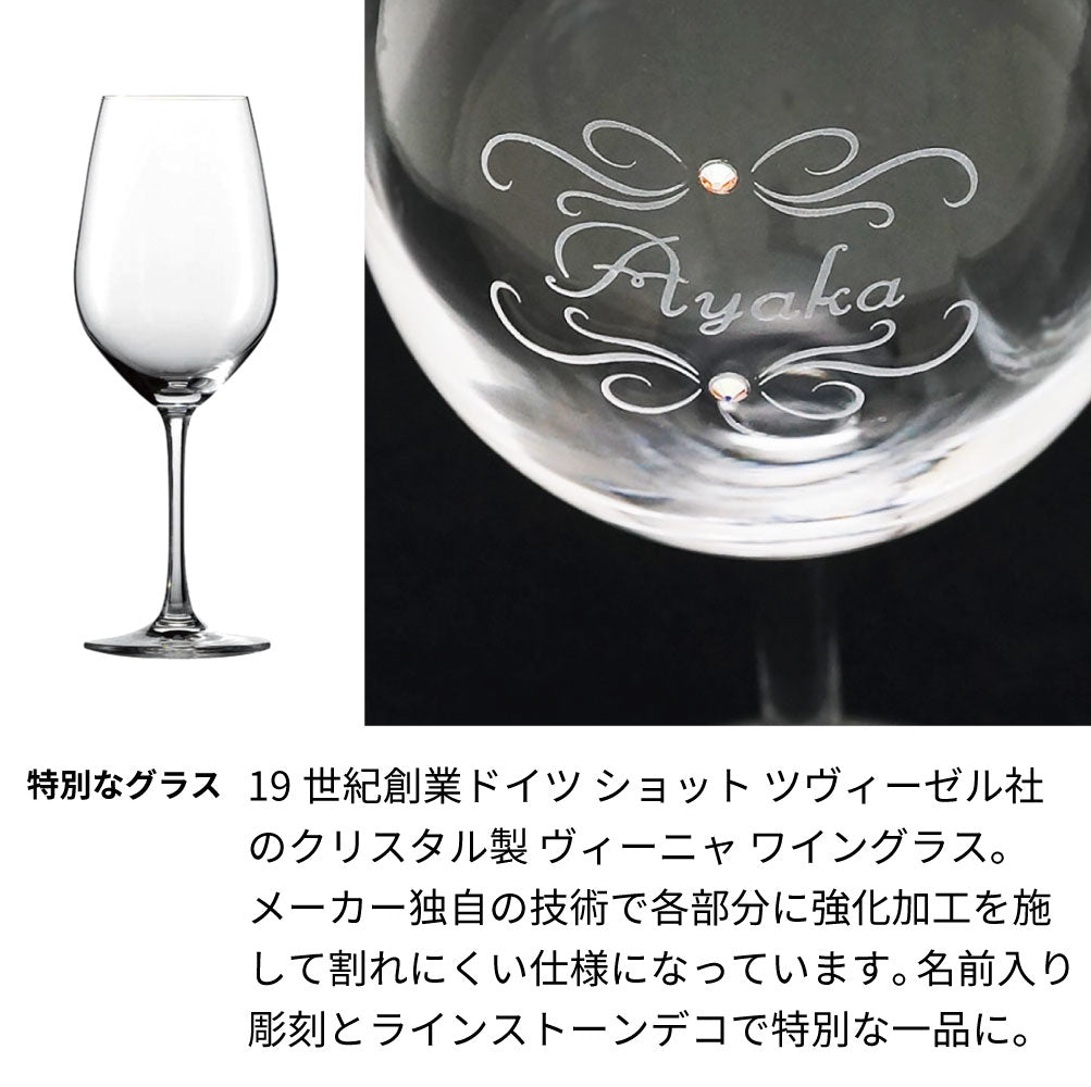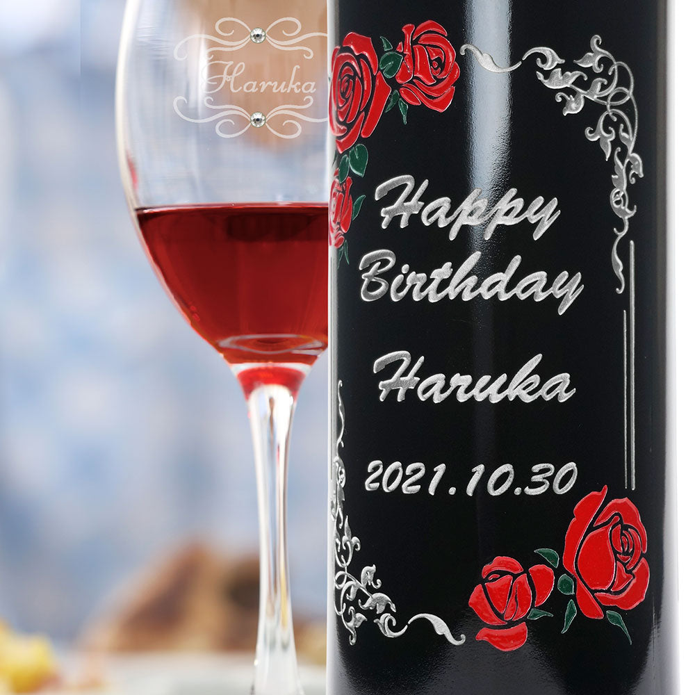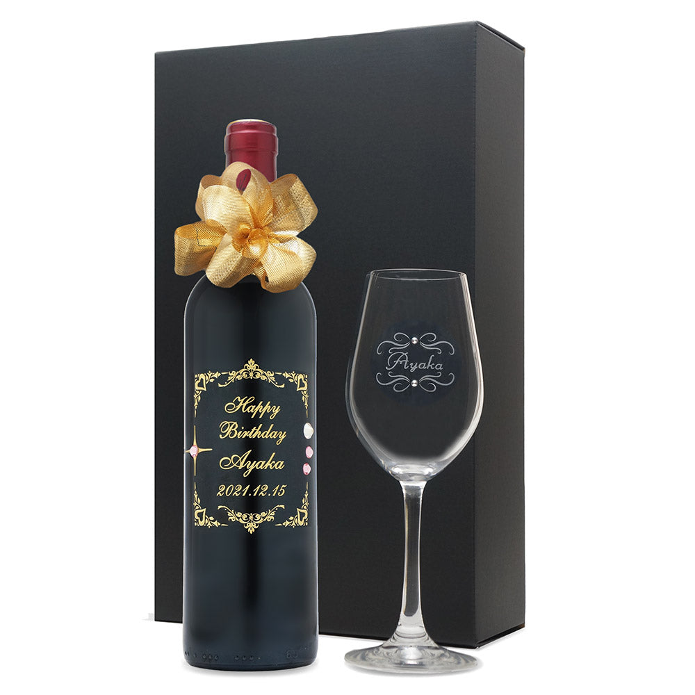 当ショップ厳選の赤ワイン又は白ワイン、グラスに、名前とオリジナルメッセージを彫刻、ラインストーンをデコレーションした特別な贈りものです。