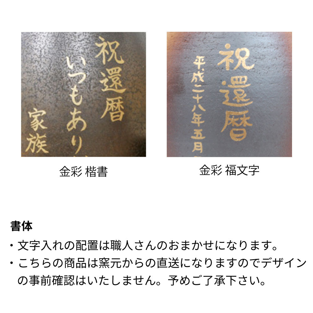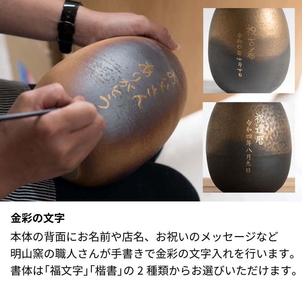 焼酎サーバー本体の背面にお名前や店名、お祝いのメッセージなどを明山窯の職人さんが手書きで金彩の特殊インクで文字入れを行います。