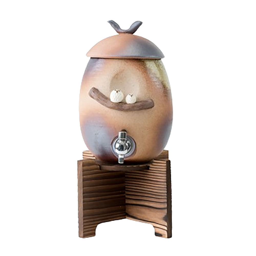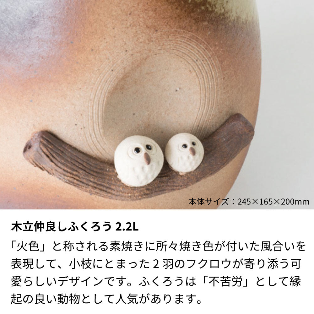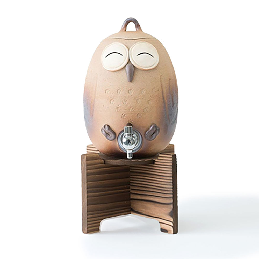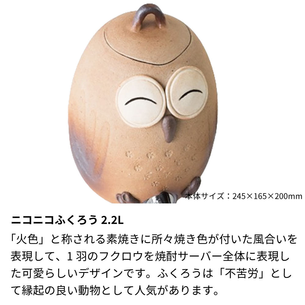 「火色」と称される素焼きに所々焼き色が付いた風合いを表現して、1羽のフクロウを焼酎サーバー全体に表現した可愛らしいデザインです。ふくろうは「不苦労」として縁起の良い動物として人気があります。