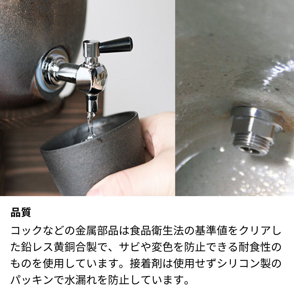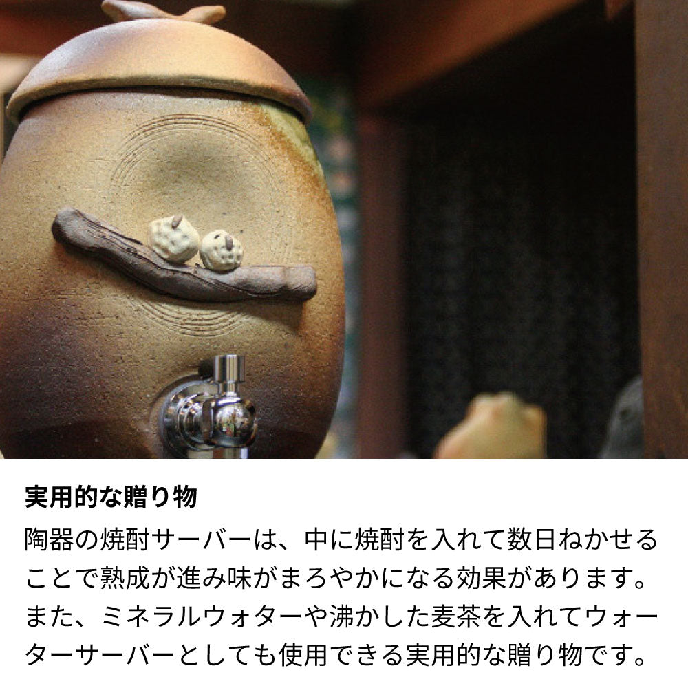 陶器の焼酎サーバーは、中に焼酎を入れて数日ねかせることで熟成が進み味がまろやかになる効果があります。また、ミネラルウォターや沸かした麦茶を入れてウォーターサーバーとしても使用できる実用的な贈り物です。