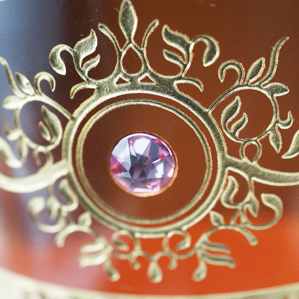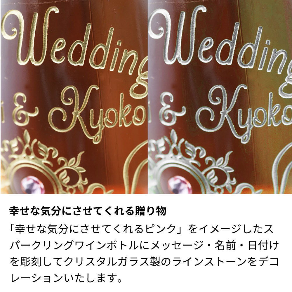 「幸せな気分にさせてくれるピンク」をイメージしたスパークリングワインボトルにメッセージ・名前・日付けを彫刻してクリスタルガラス製のラインストーンをデコレーションいたします。
