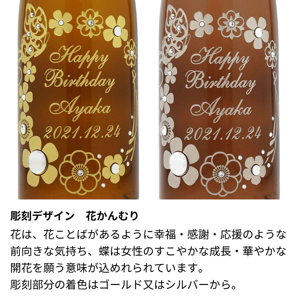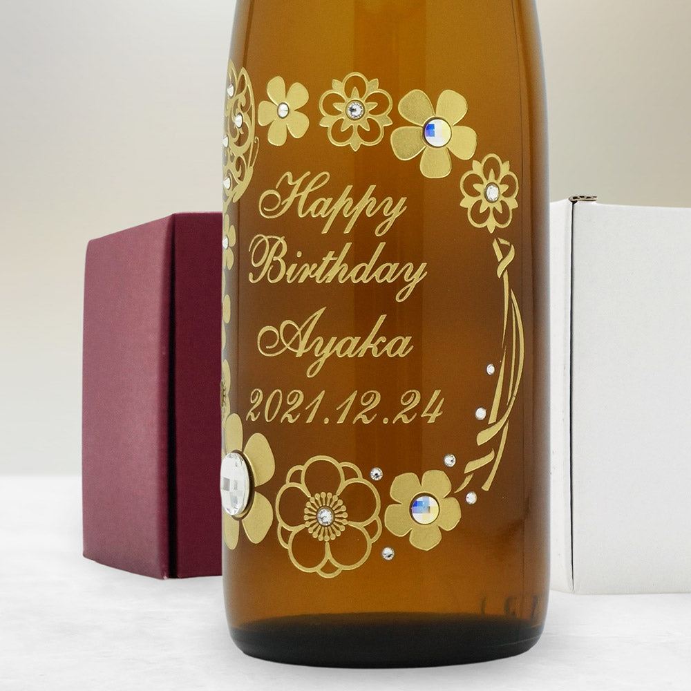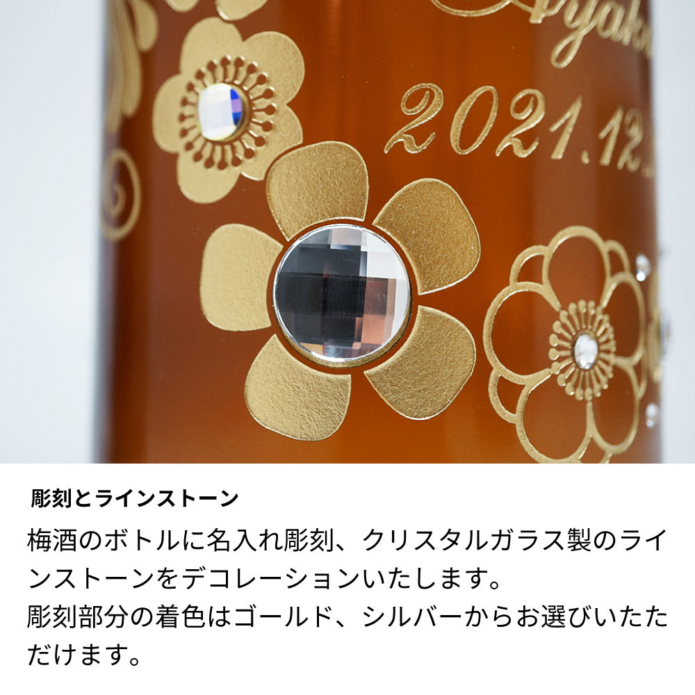 梅酒のボトルにお名前、メッセージを彫刻、クリスタルガラス製のラインストーンをデコレーションしています。