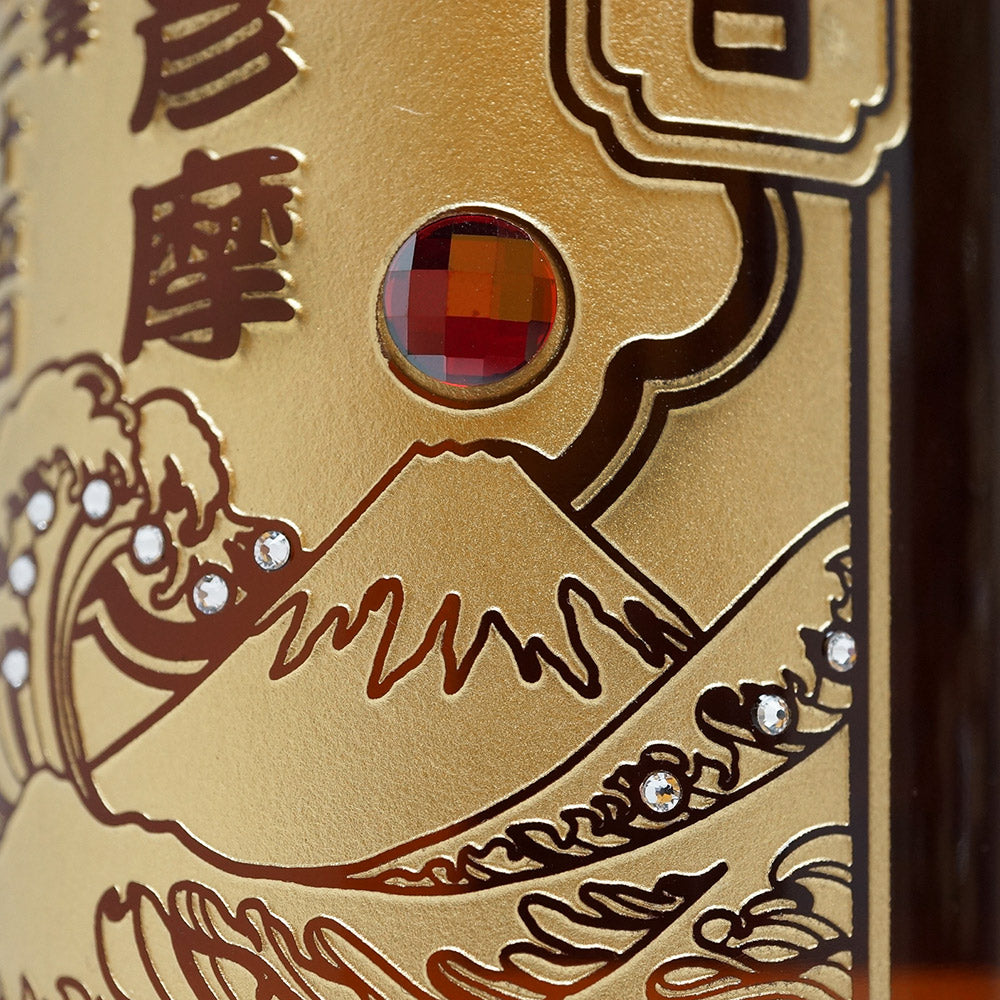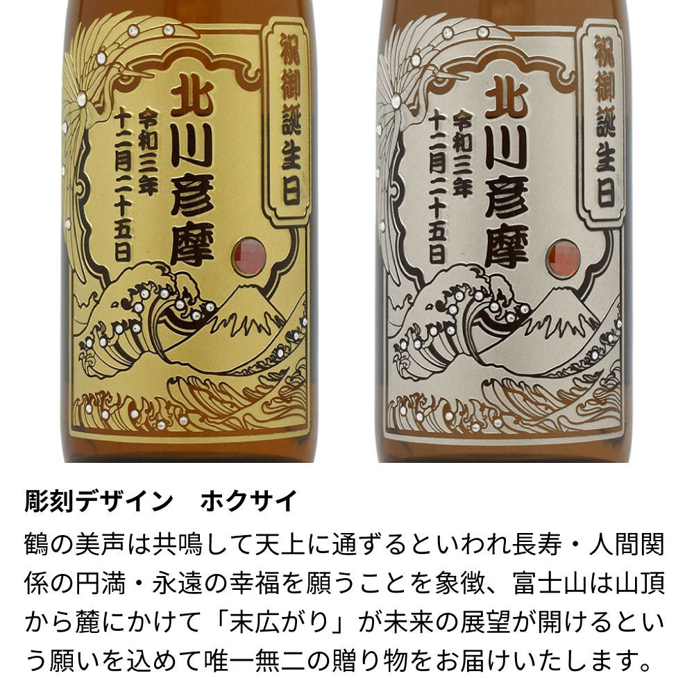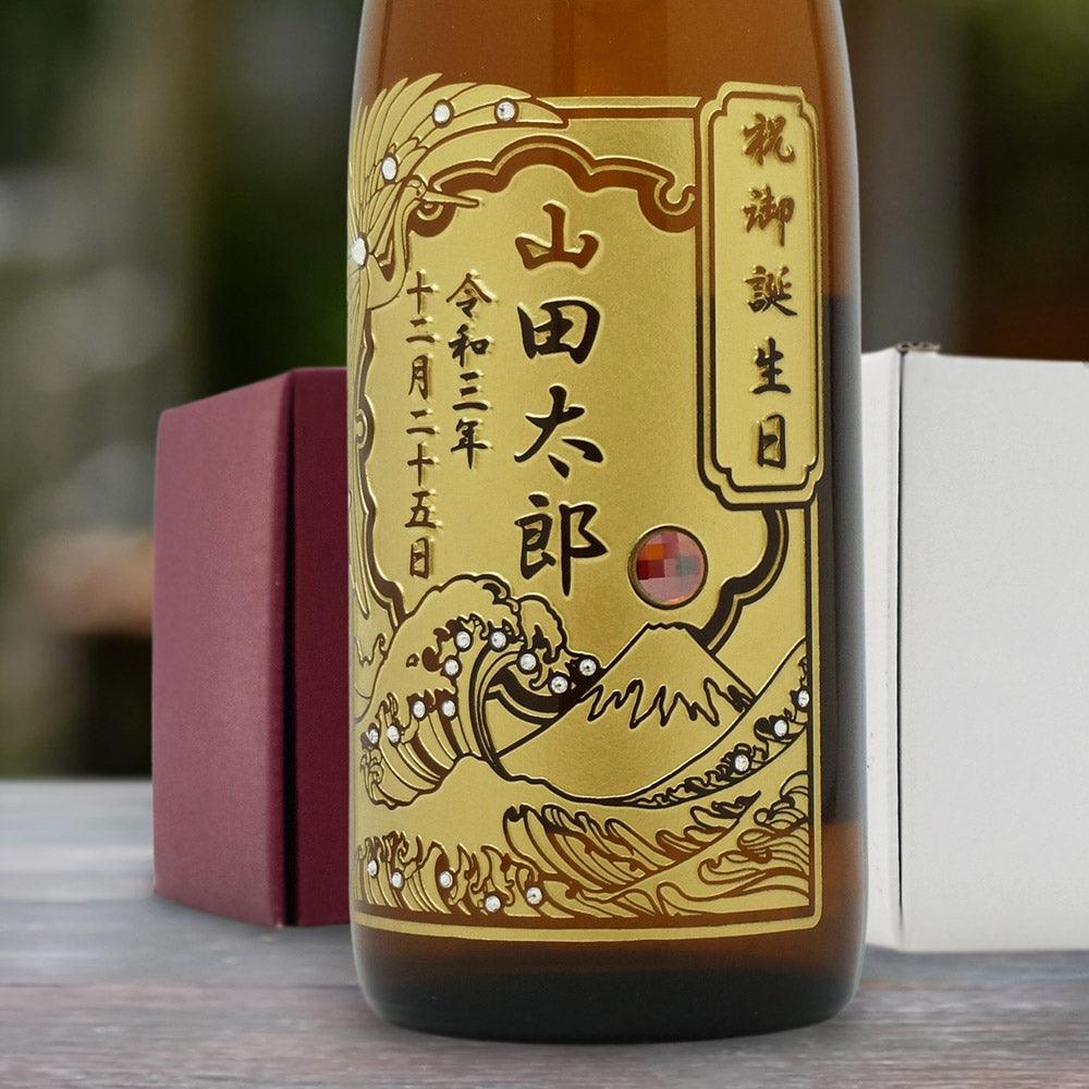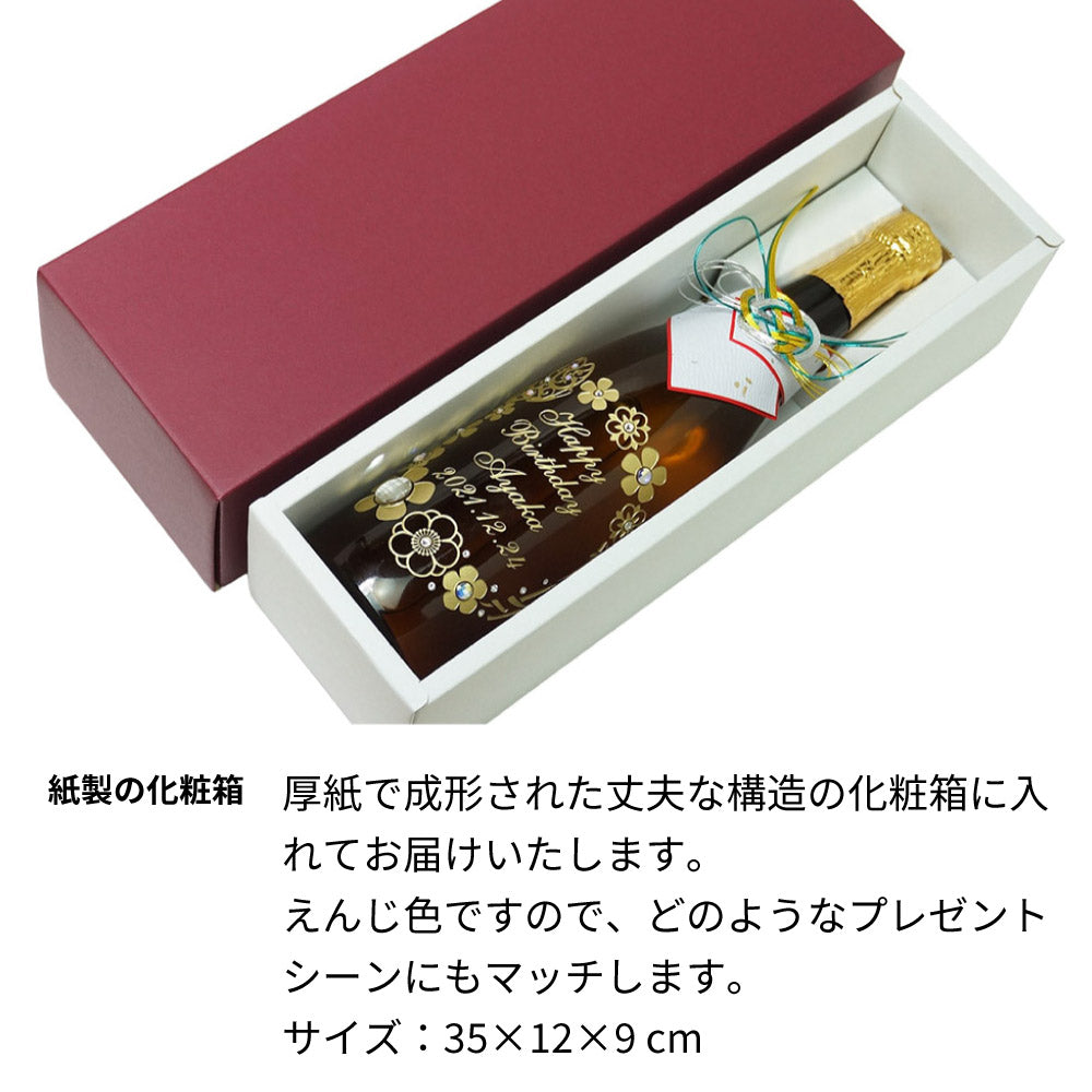 梅酒のボトルにお名前、メッセージを彫刻、クリスタルガラス製のラインストーンをデコレーションしています。
