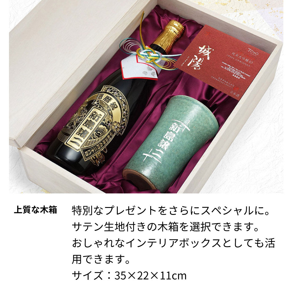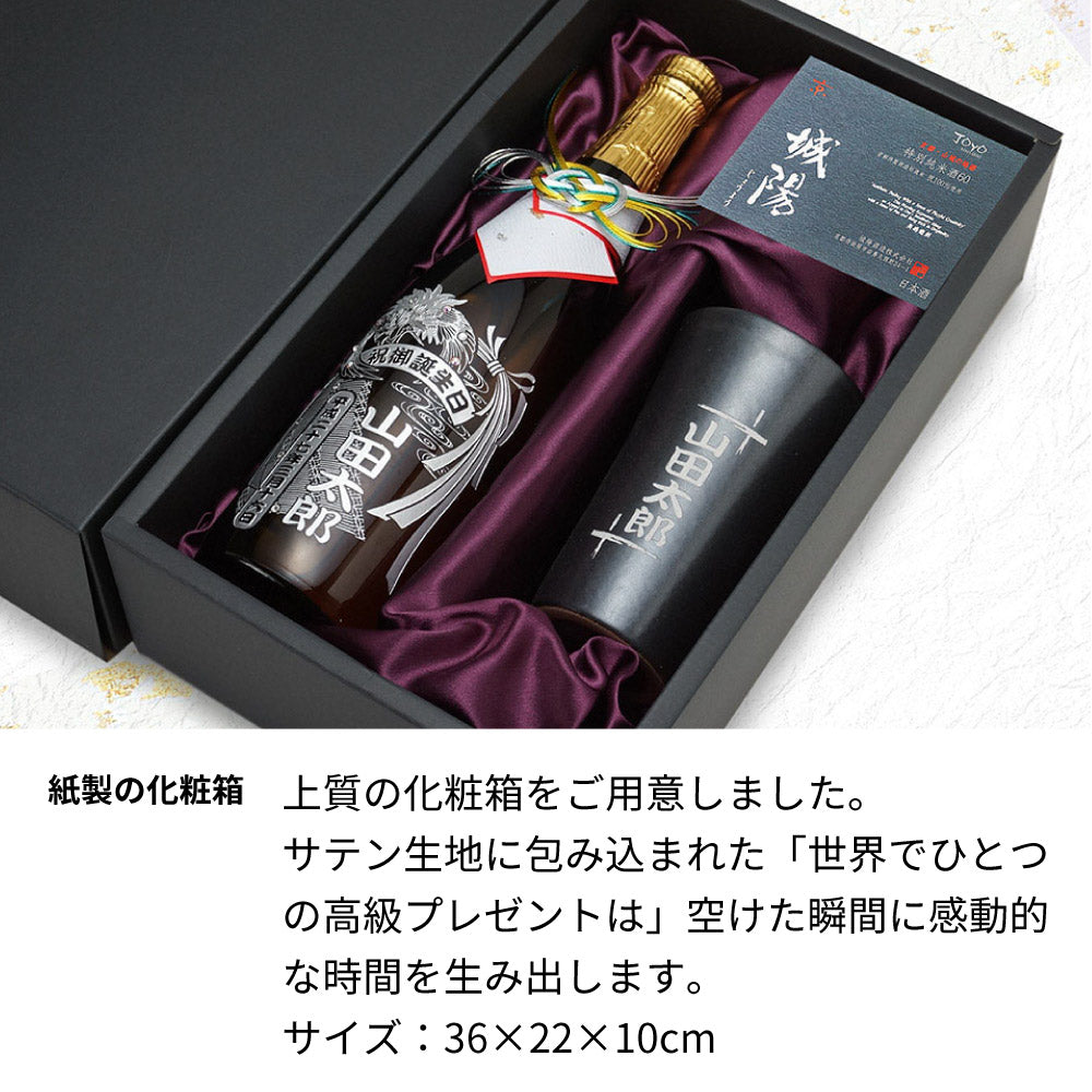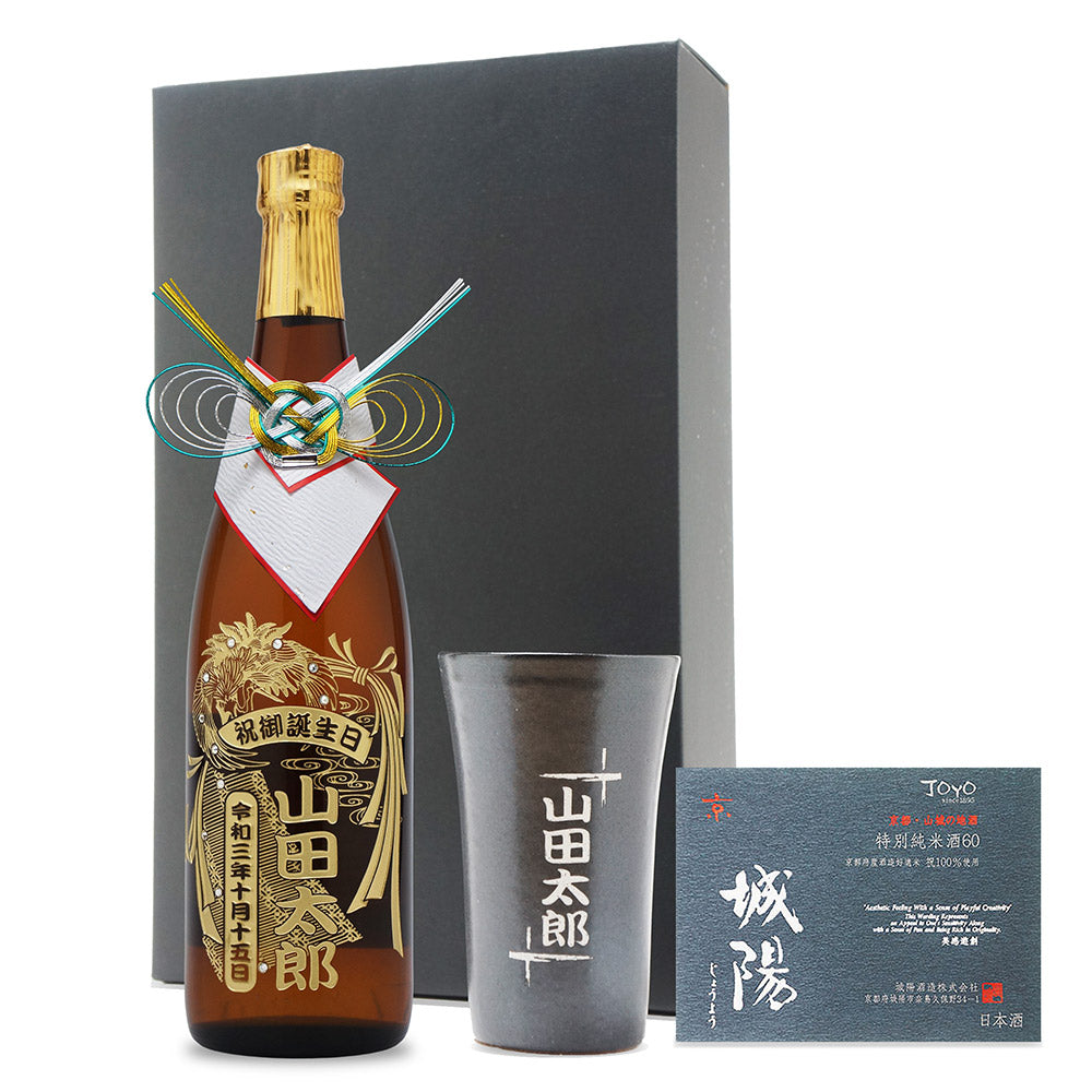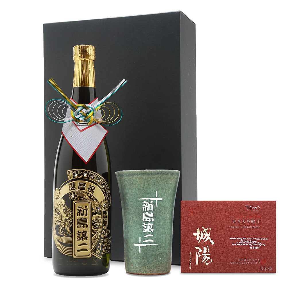 京都産の日本酒 城陽のボトルに美しいデザイン・お名前を彫刻、クリスタルガラス製のスワロフスキーを装飾したオリジナルギフトです。 名入れ彫刻の信楽焼きの陶器コップをセットにしています。