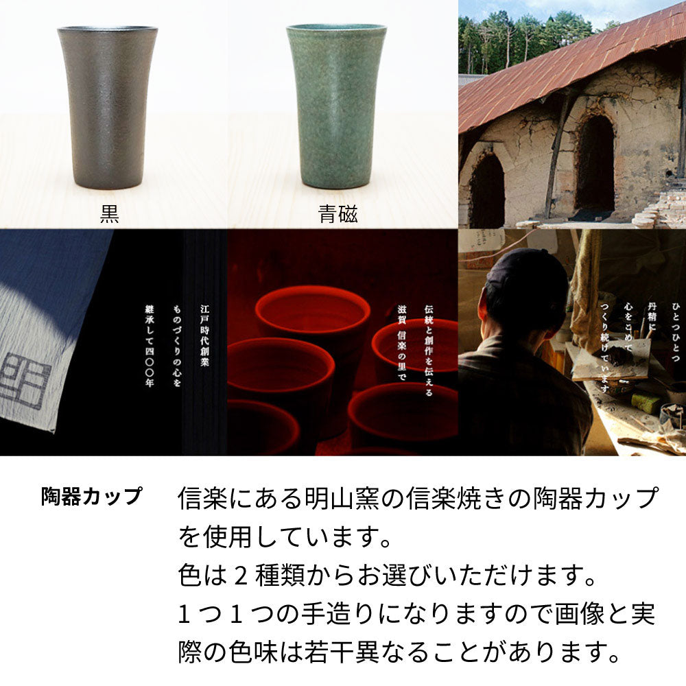 【信楽焼の陶器】 滋賀県甲賀市にある信楽焼窯元の明山窯の陶器コップです。 陶器で作られた器は日本酒の味をまろやかにしてさらにおいしくする効果があります。香りとコクのある日本酒を陶器で飲むと、口の中一杯に広がる香りを堪能することができます。