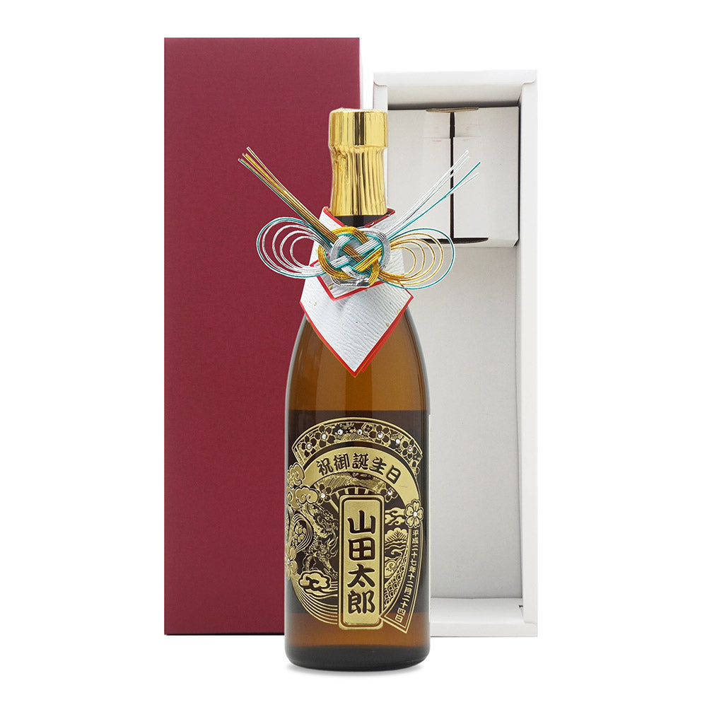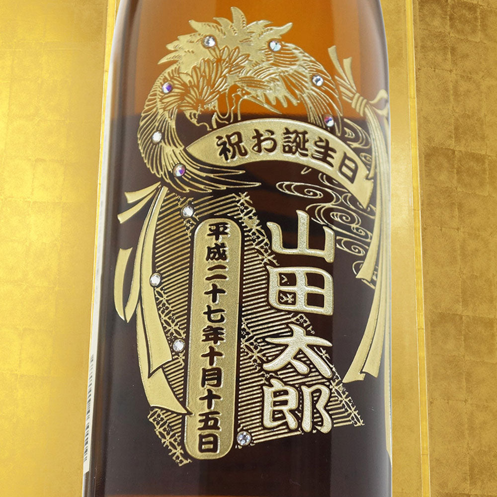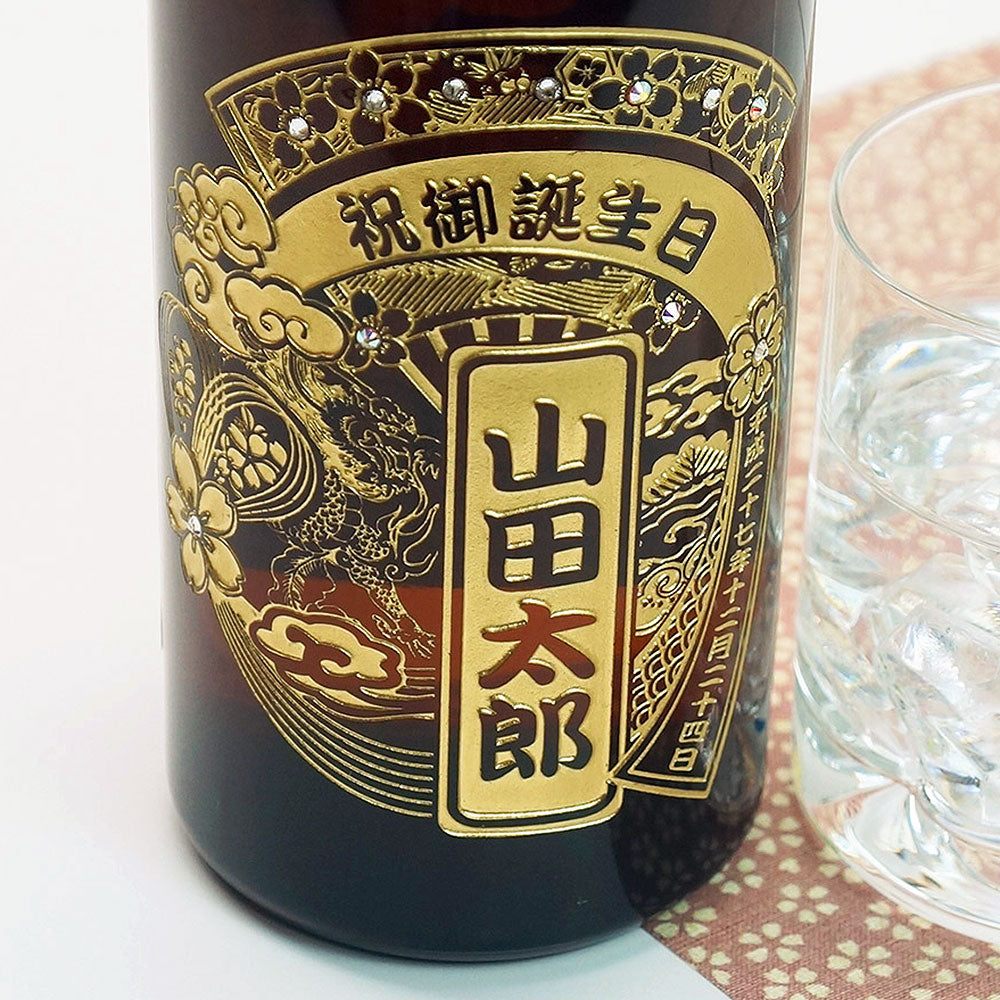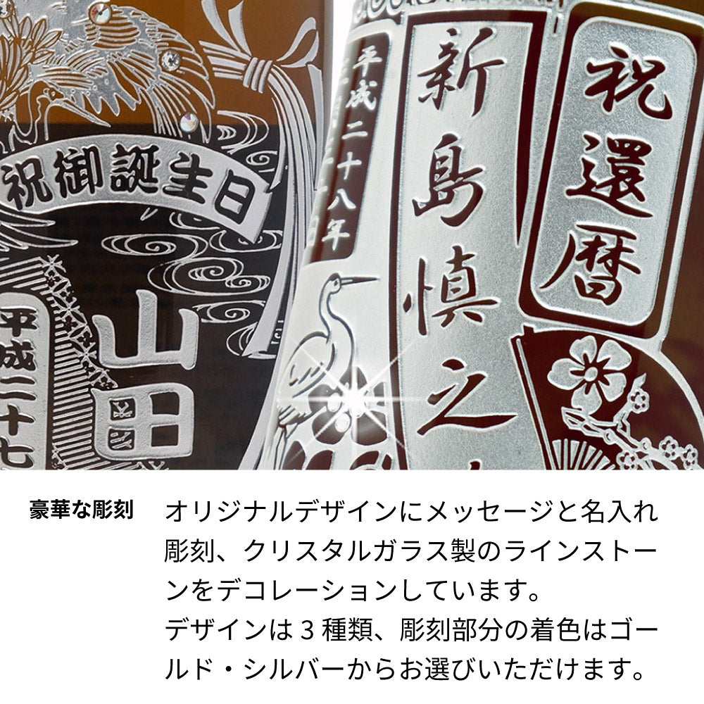 九州 鹿児島産の芋焼酎 「利八 白」 に美しいデザイン・お名前を彫刻したオリジナルギフトです。