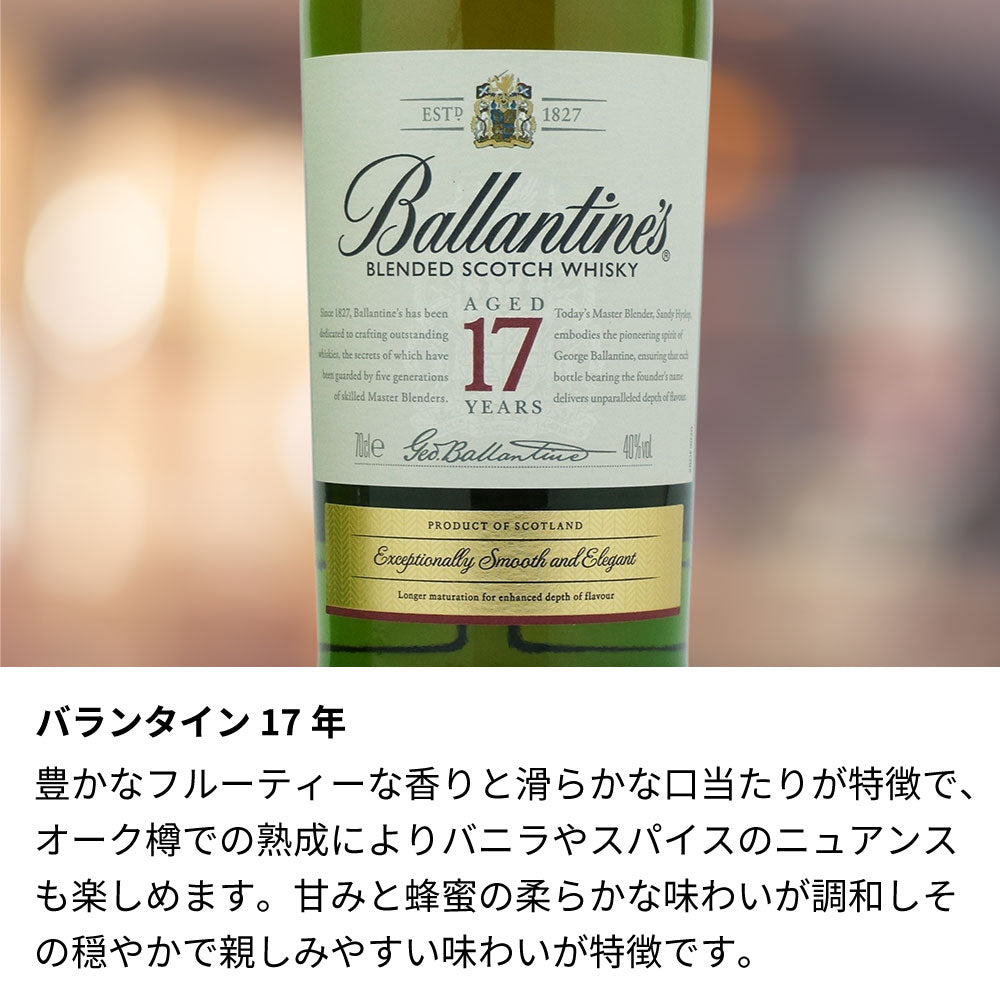バランタイン社のブレンド技術により、原酒それぞれの個性が引き出され、バランスよく複雑な香り・味わいを実現しています。