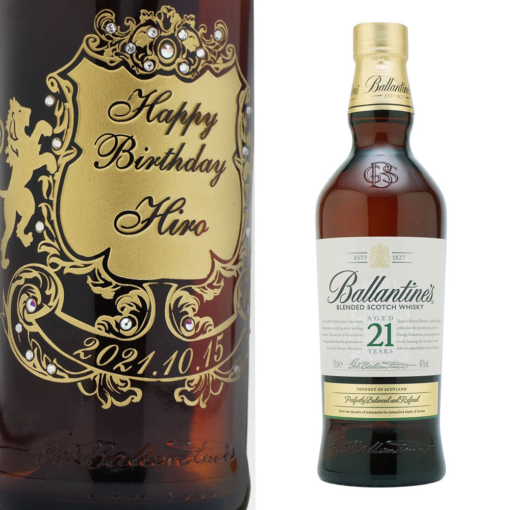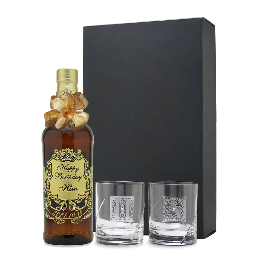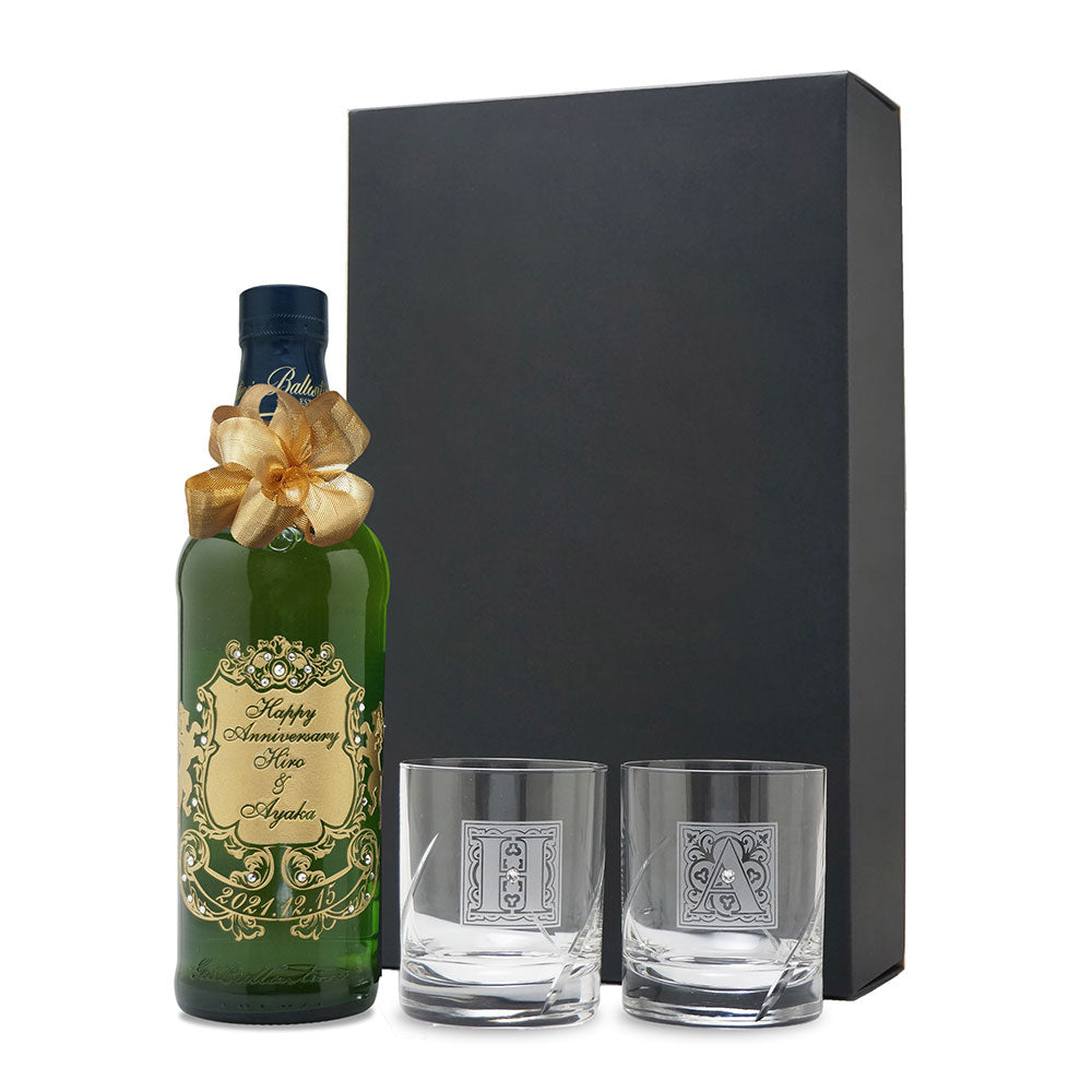 高級ウイスキーのバランタイン17年・21年に、名前とオリジナルメッセージを彫刻、スタイリッシュな切子入りのペアグラスにイニシャルの彫刻、ラインストーンをデコレーションした特別な贈り物です。