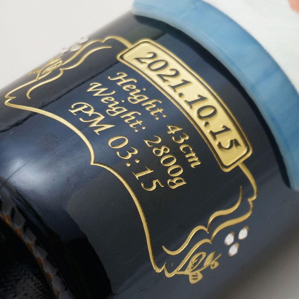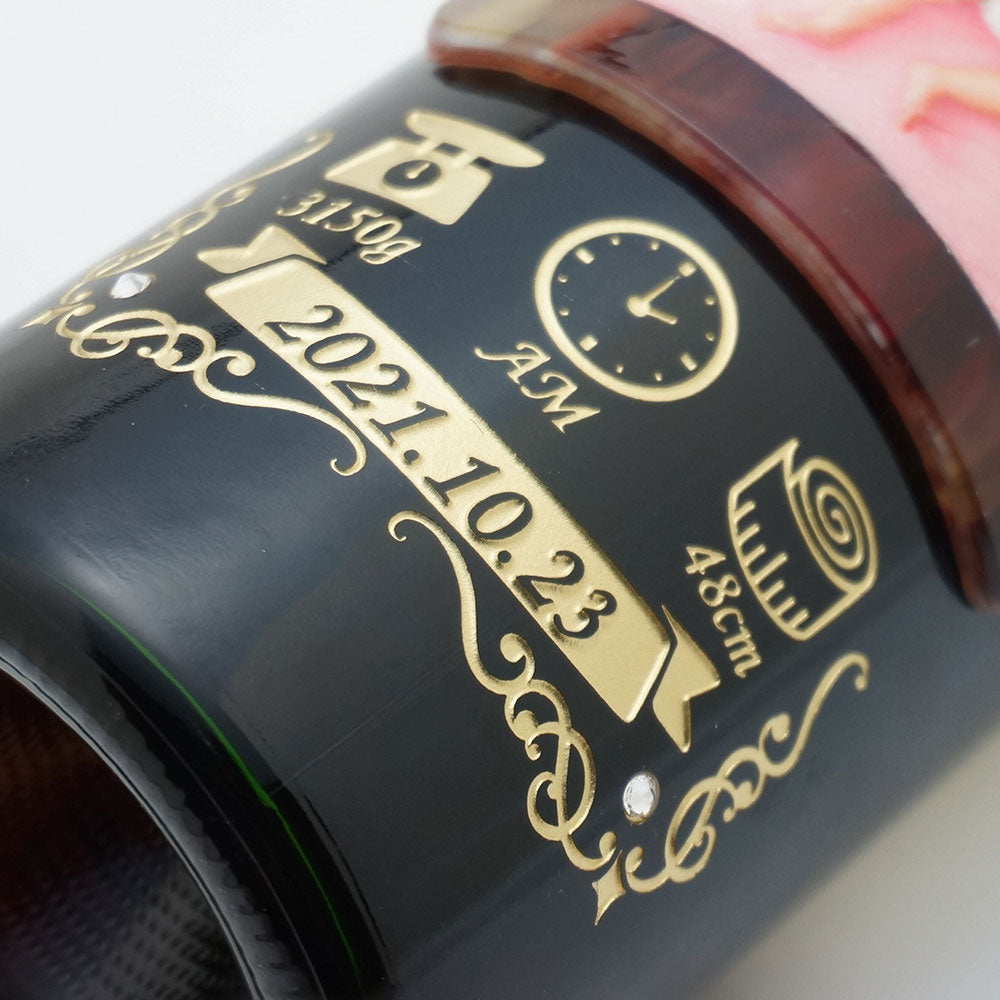 娘の写真と共に生まれた日の記録が刻まれたワインボトルは「ステキすぎて開けるのが勿体無い!」と、とても喜んでもらえました。