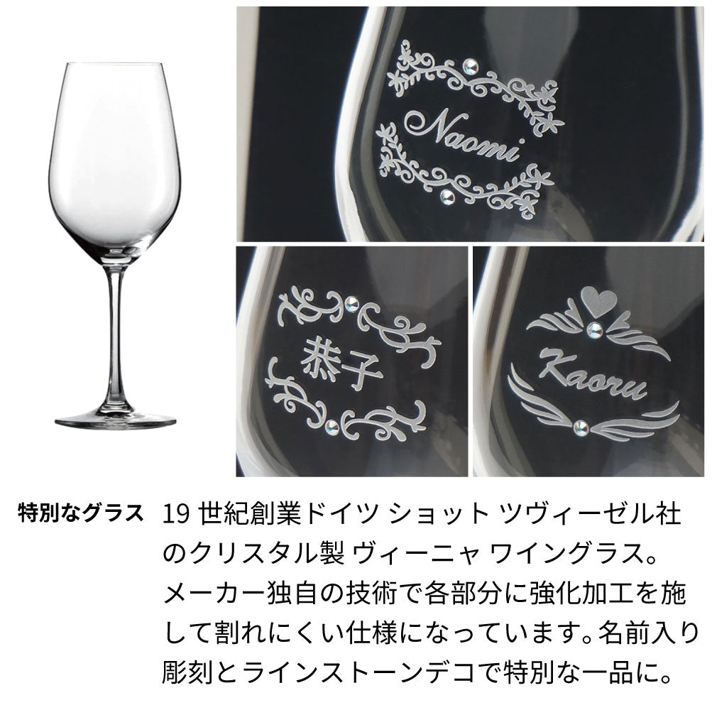 ワインボトルにはメッセージ・お名前・日付を彫刻、グラスにお名前を彫刻してラインストーンを装飾いたします。