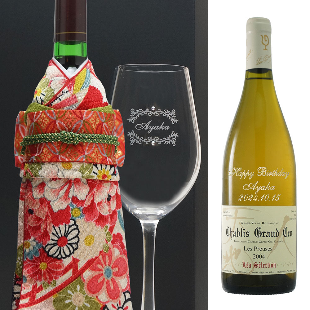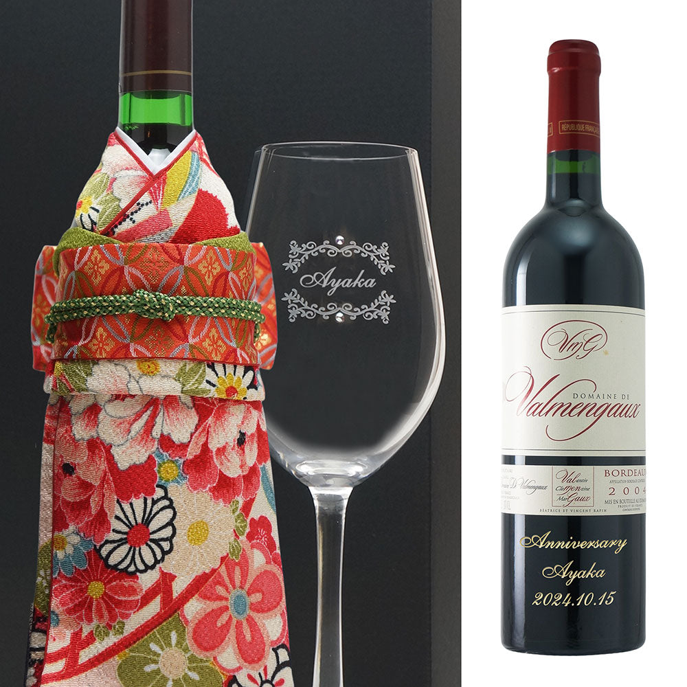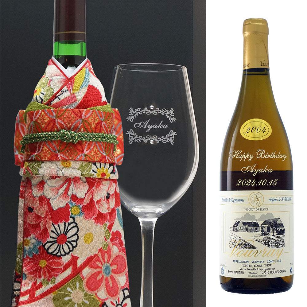 2004年に収穫されたブドウで醸造・熟成された生まれ年ワインに着物をかぶせた「世界に1つ」の贈り物です。