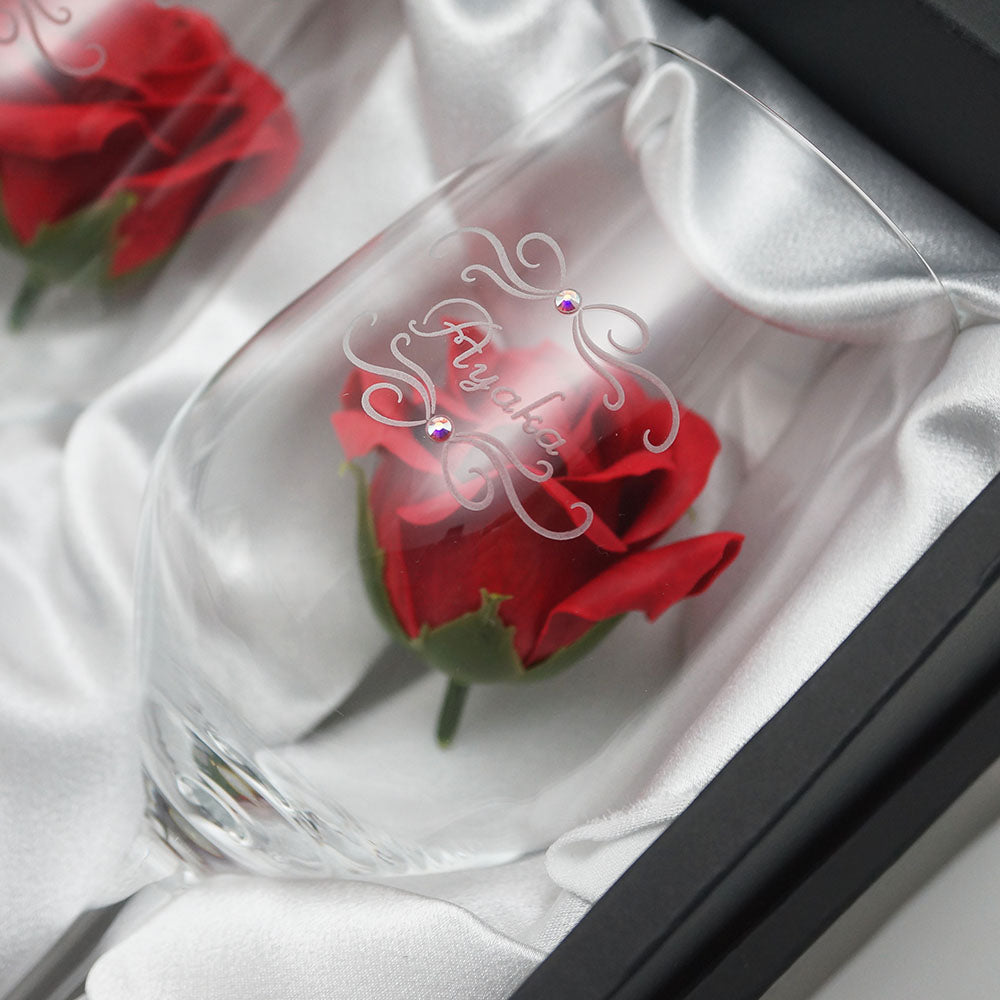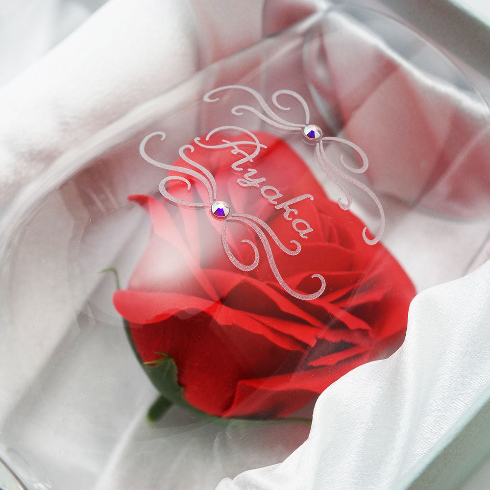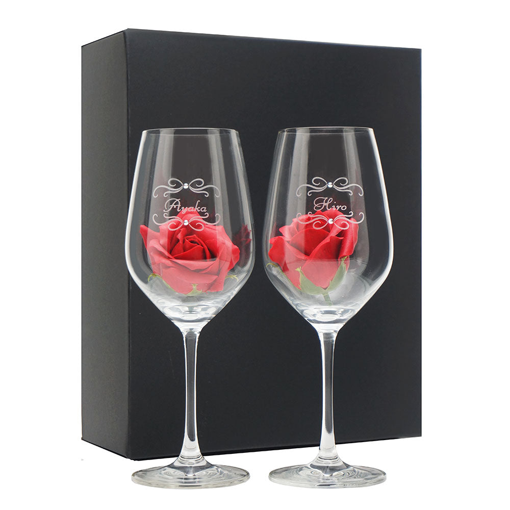 名前入り彫刻 ペアワイングラス ラインストーンデコ ソープフラワー付 化粧箱入