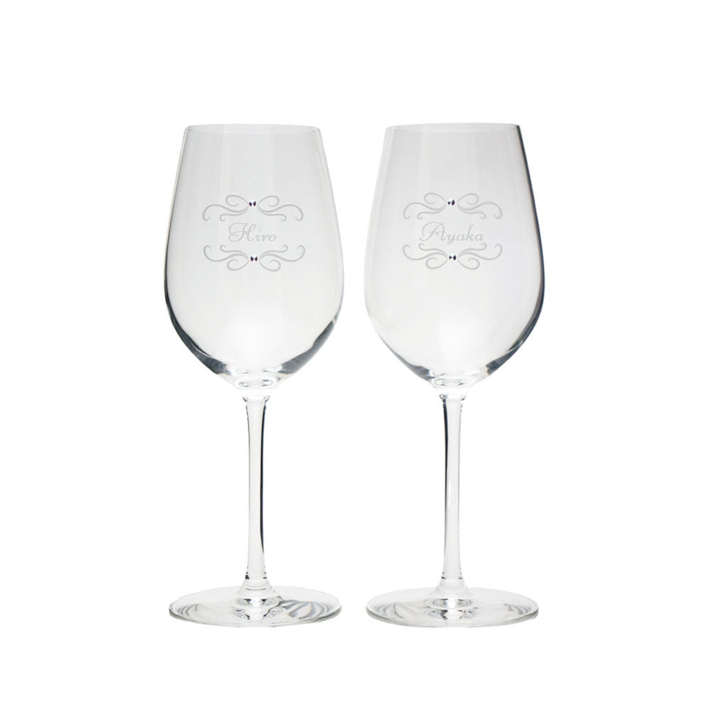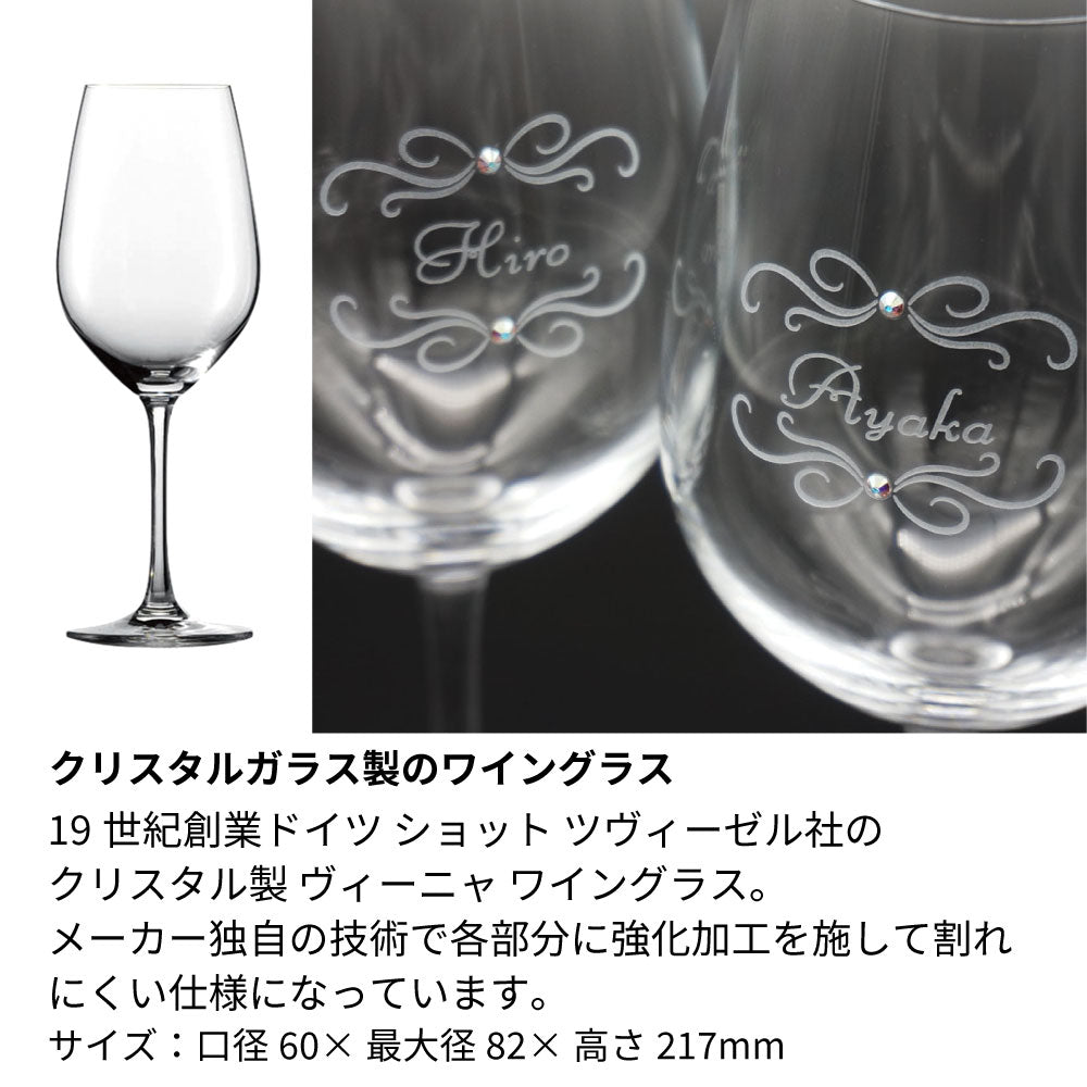 ペアワイングラスにお名前を彫刻してクリスタルガラス製ラインストーンをデコレーションいたします。
