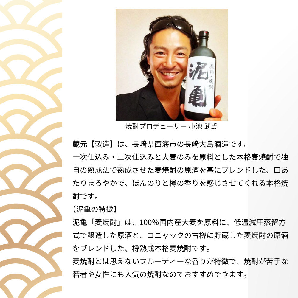泥亀「麦焼酎」は、100%国内産大麦を原料に、低温減圧蒸留方式で醸造した原酒と、コニャックの古樽に貯蔵した麦焼酎の原酒をブレンドした、樽熟成本格麦焼酎です。 麦焼酎とは思えないフルーティーな香りが特徴で、焼酎が苦手な若者や女性にも人気の焼酎です。