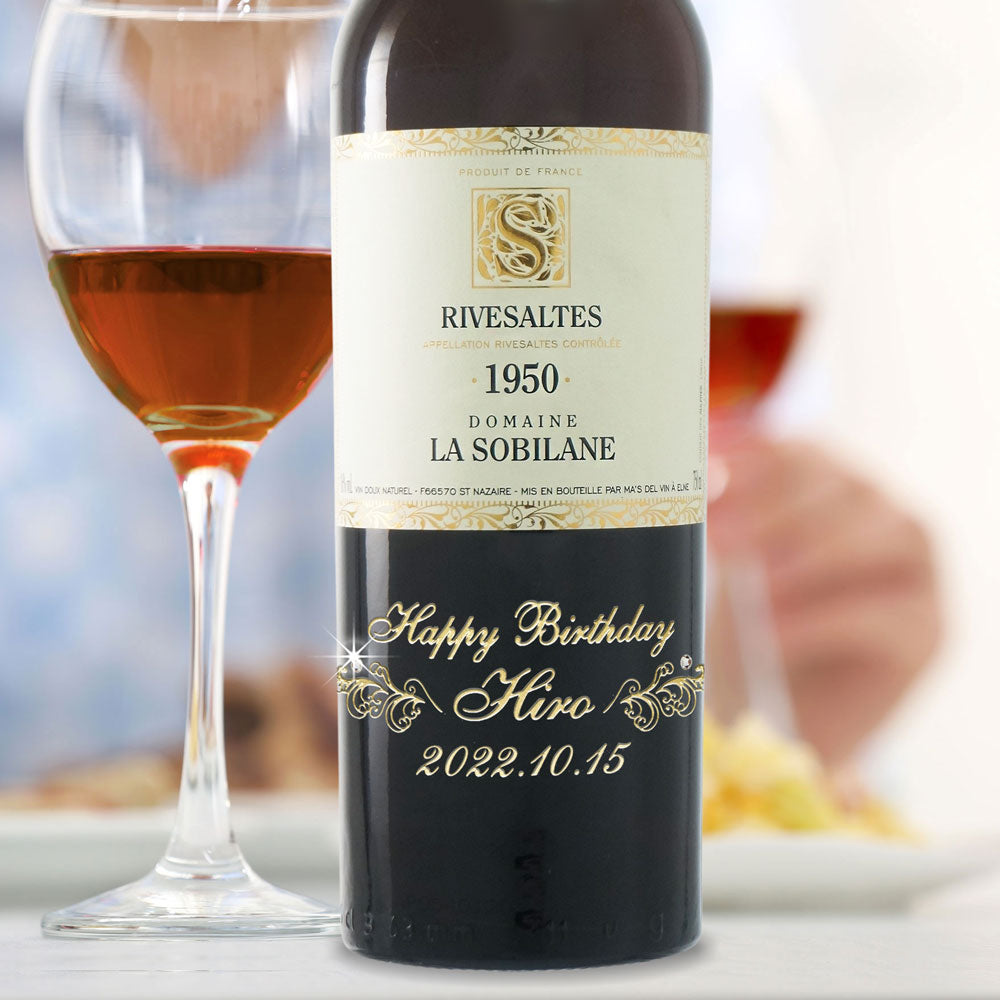 1950年に収穫されたブドウで作られた生まれ年ワインに、名前やメッセージを彫刻して贈る、特別なオーダーメイドギフト。誕生日や記念日に、世界でひとつだけの感動をお届けします。