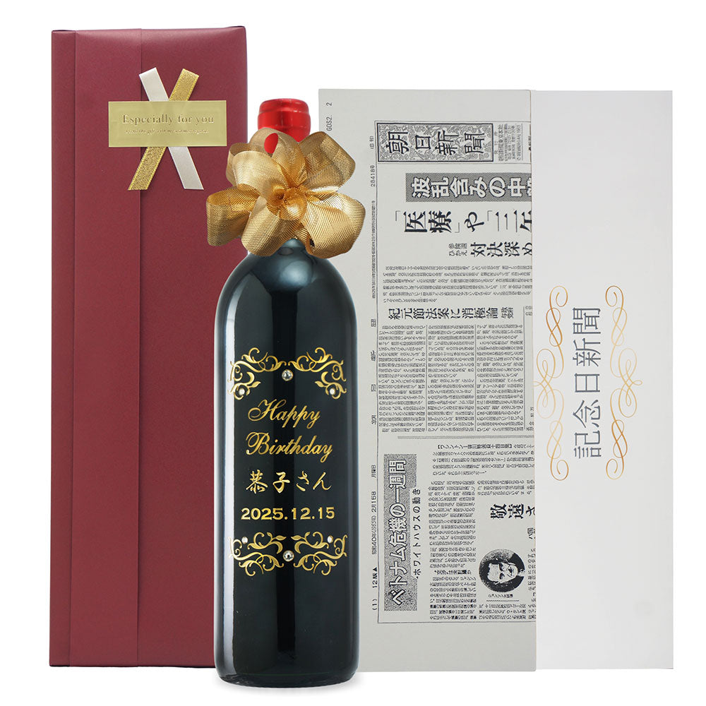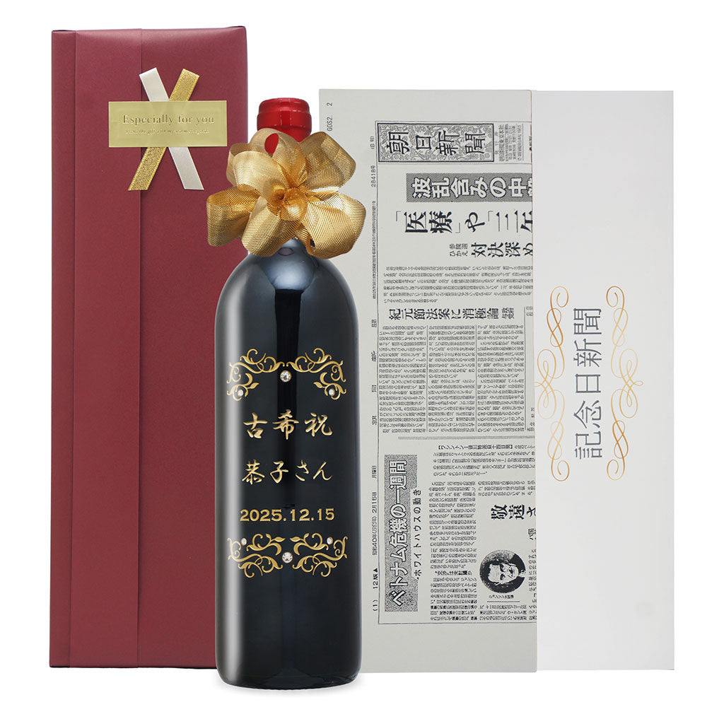 古希祝い 70年前の新聞付き神戸ワイン 名入れ彫刻ボトル 木箱入