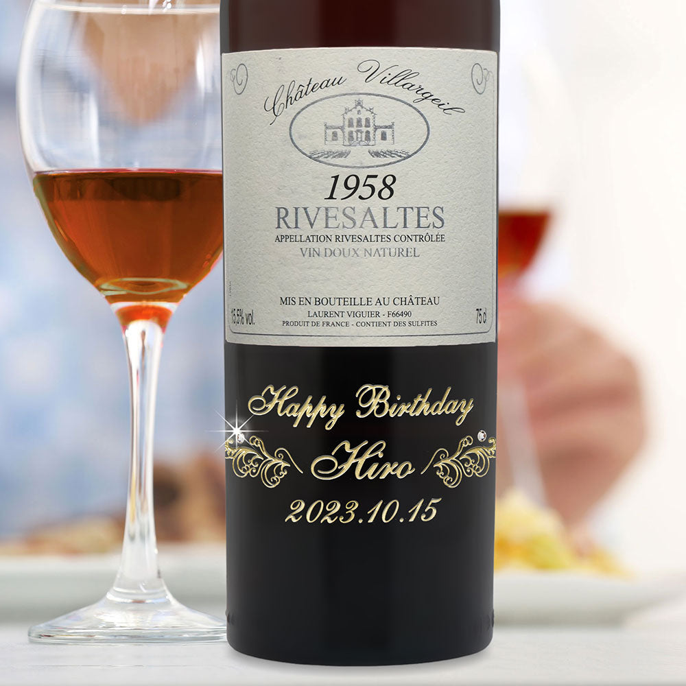 1958年に収穫されたブドウで作られた生まれ年ワインに、名前やメッセージを彫刻して贈る、特別なオーダーメイドギフト。誕生日や記念日に、世界でひとつだけの感動をお届けします。