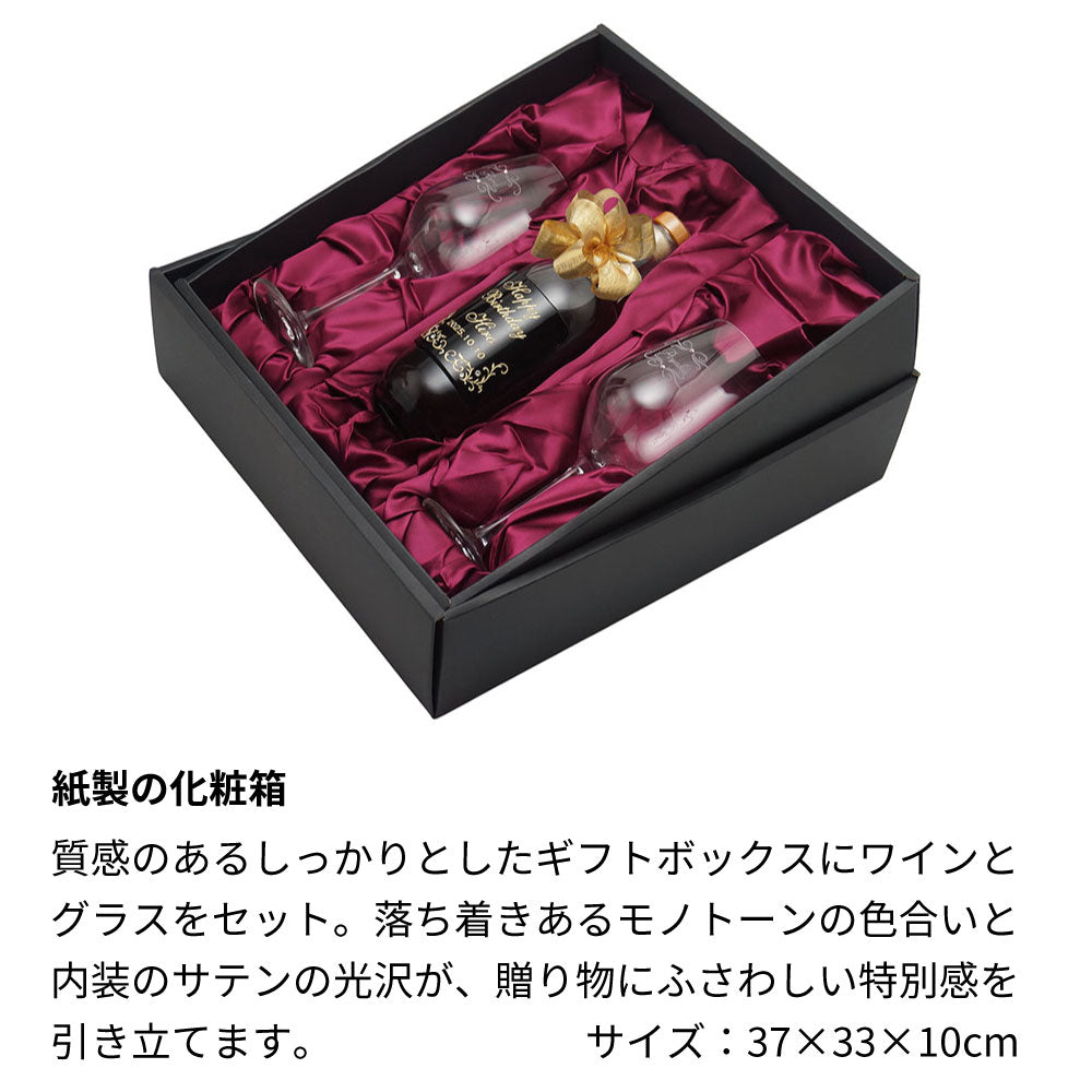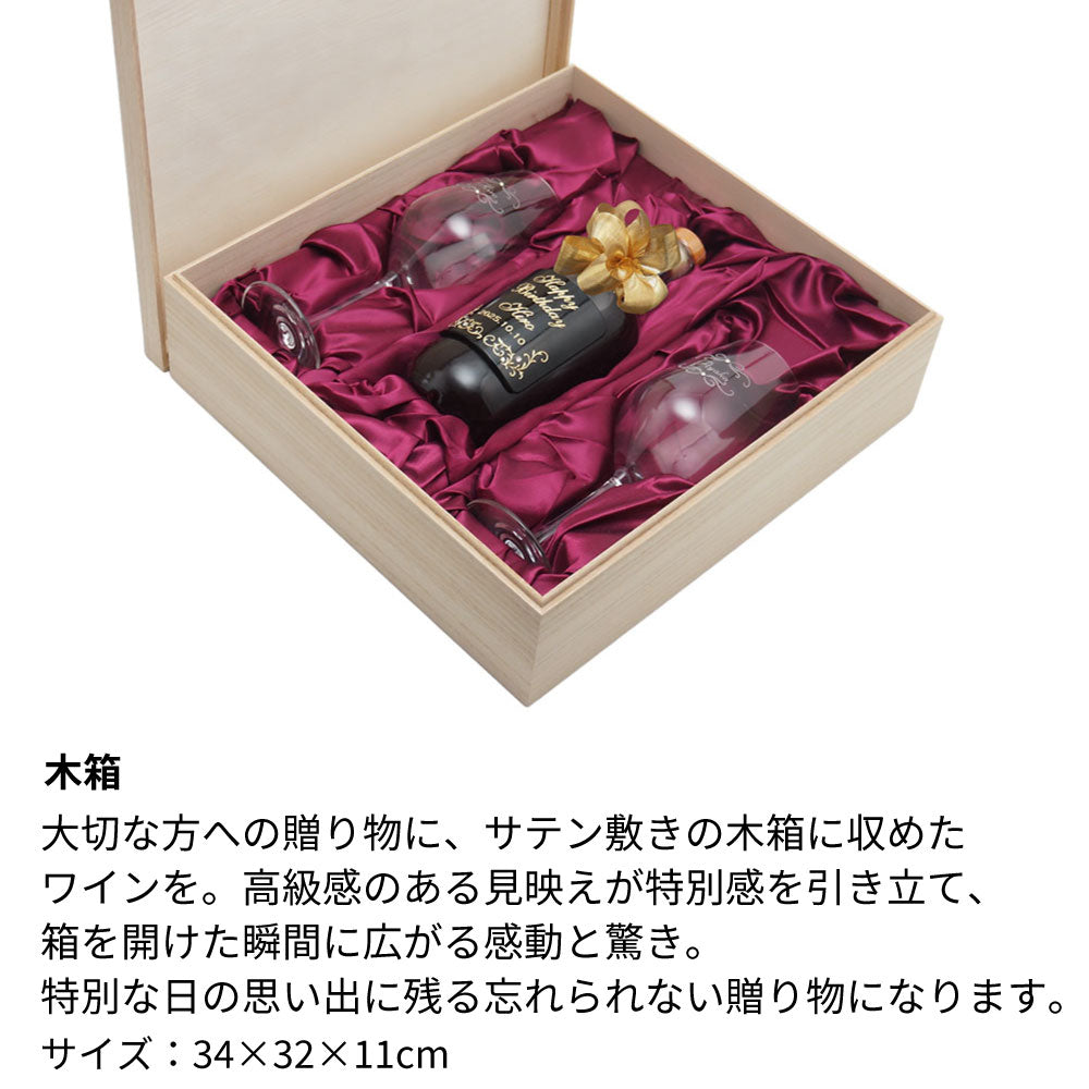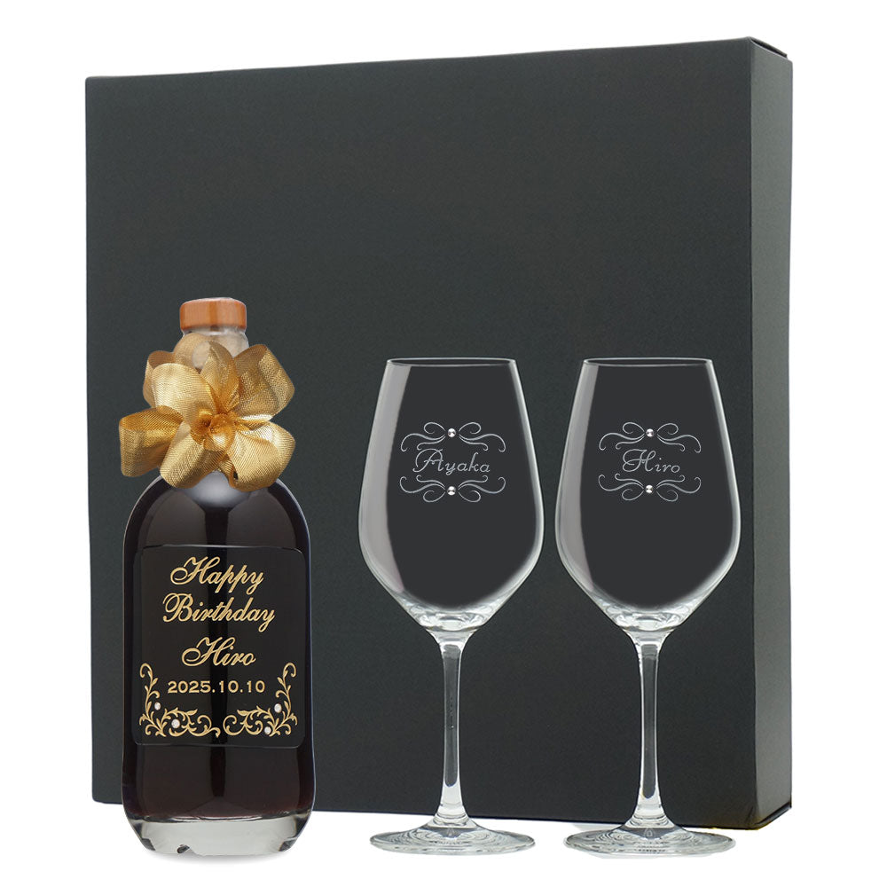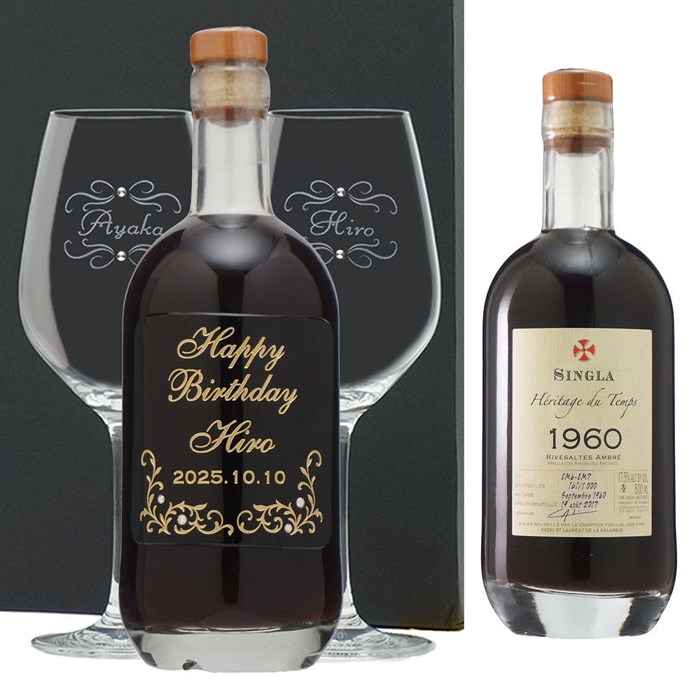 1960年にフランスで収穫されたブドウから造られたヴィンテージワインとペアワイングラスをセットにした贈り物です。 お名前やメッセージをガラス製ラベルに彫刻し、ボトルに取り付けてお届けします。