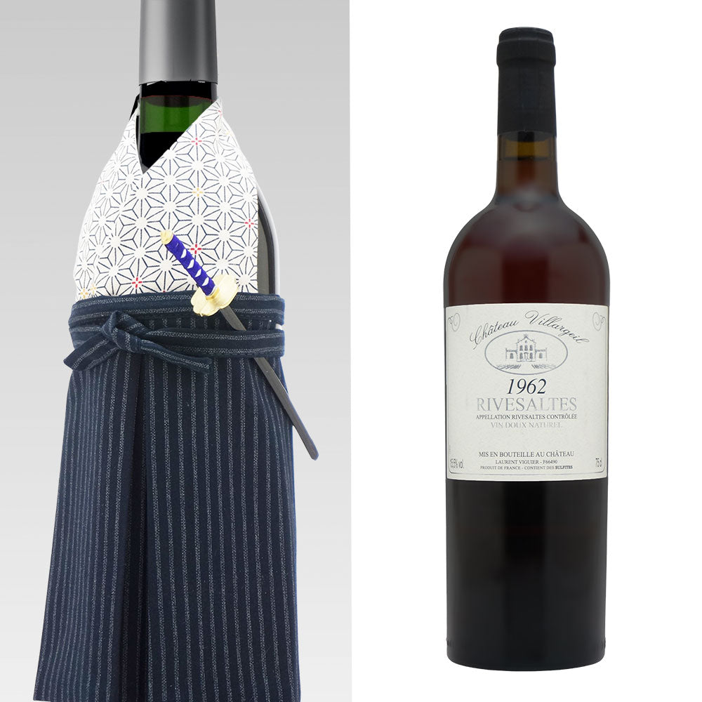 1962年に収穫されたブドウで醸造・熟成された生まれ年ワインに着物をかぶせた「世界に1つ」の贈り物です。