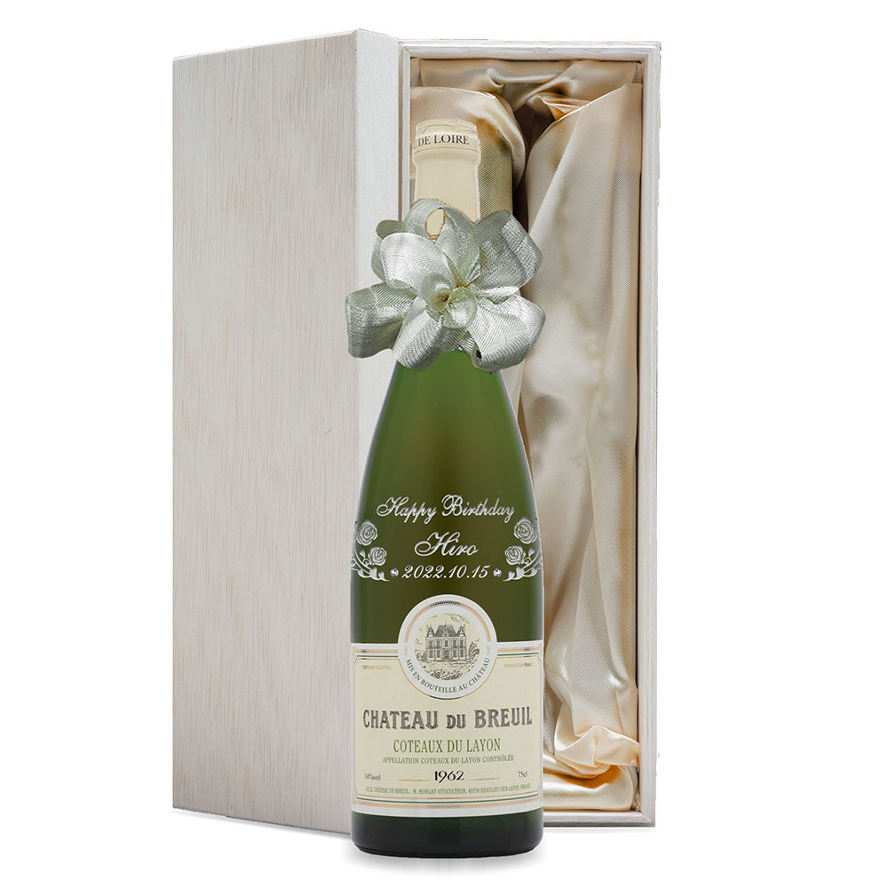 1962年に収穫されたブドウで作られた生まれ年ワインに、名前やメッセージを彫刻して贈る、特別なオーダーメイドギフト。誕生日や記念日に、世界でひとつだけの感動をお届けします。