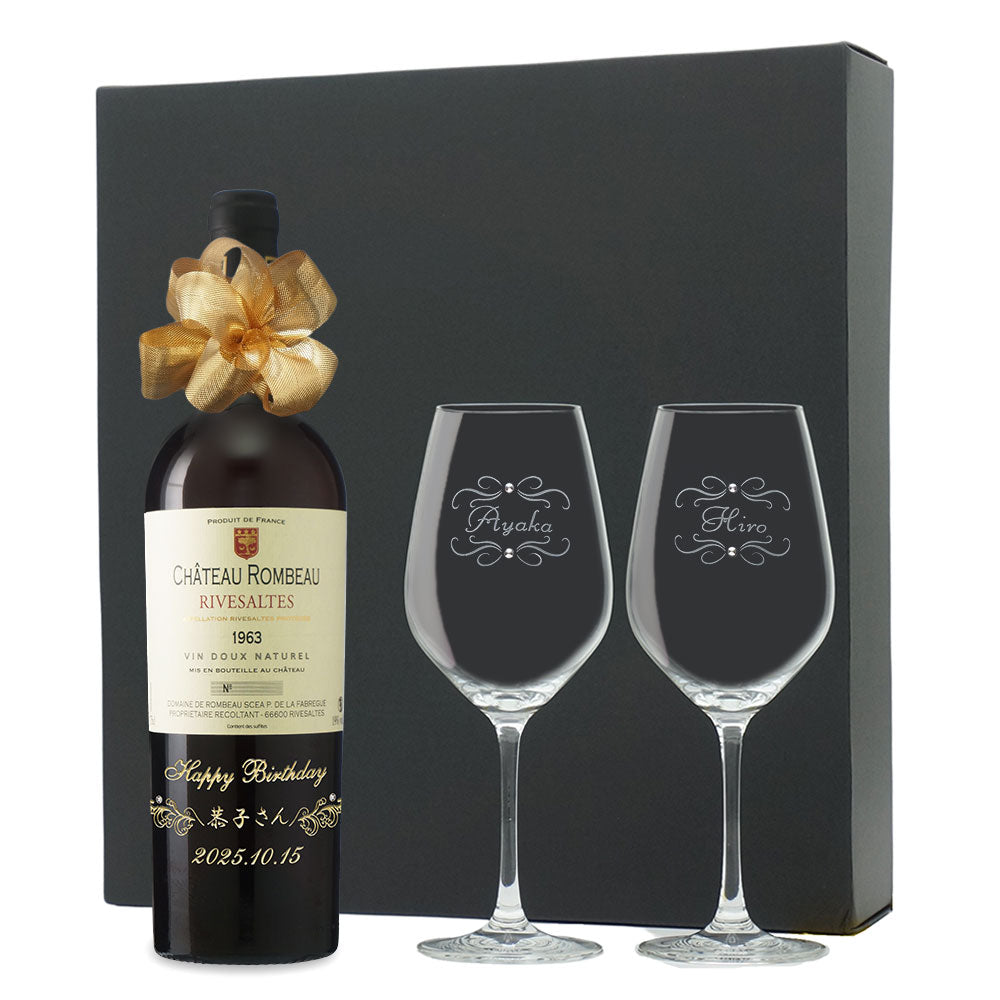 1963年、フランスで収穫されたブドウで作られた生まれ年ワインに、名前やメッセージを彫刻し、ペアグラスとともに贈るオーダーメイドギフト。二人の特別な時間を彩る、感動のプレゼントです。