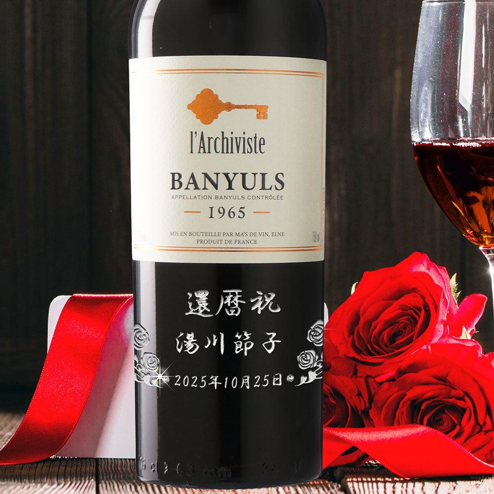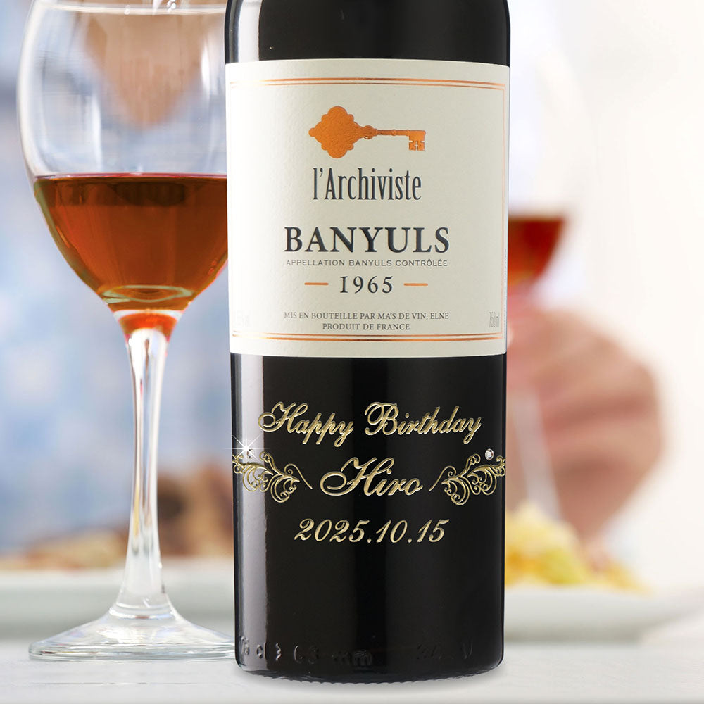 1965年、フランスで収穫されたブドウで作られた生まれ年ワインに、名前やメッセージを彫刻し、ワイングラスとともに贈る特別なオーダーメイドギフト。