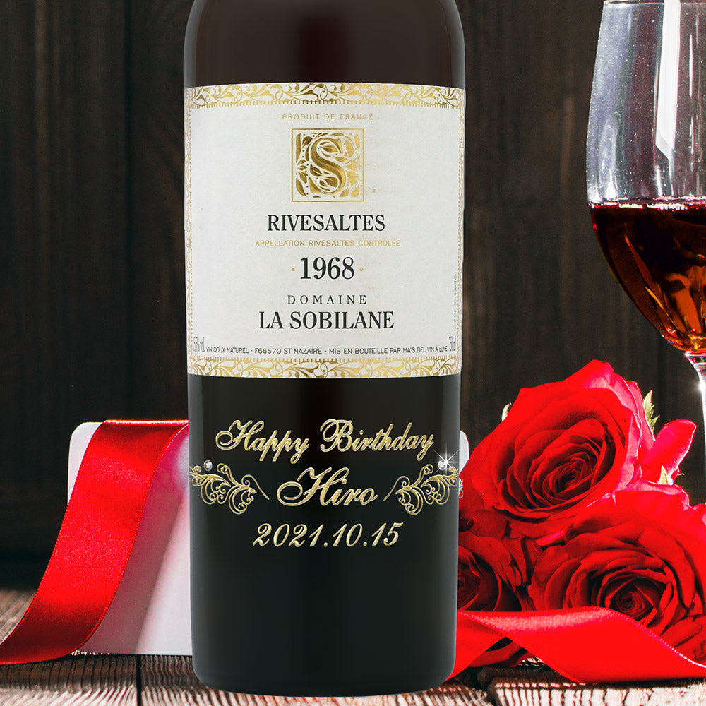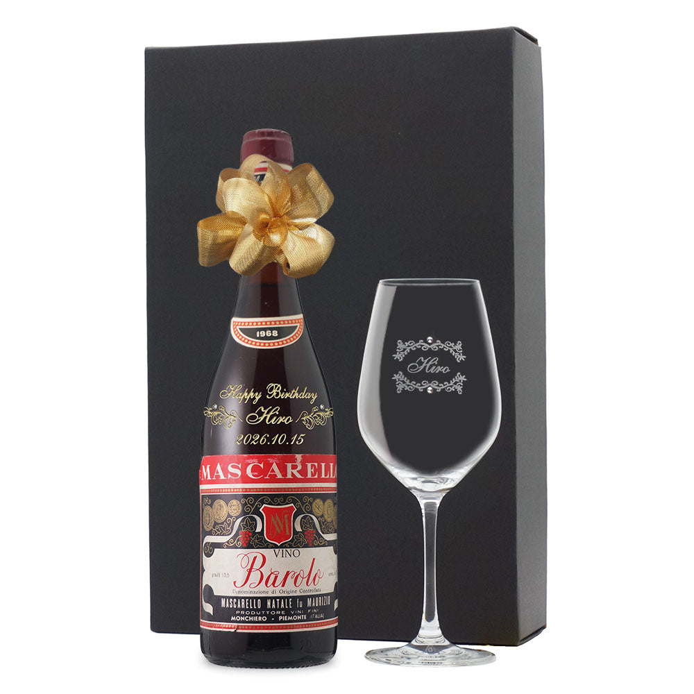 1968年に収穫されたブドウで作られた生まれ年ワインに、名前やメッセージを彫刻し、ワイングラスとともに贈る特別なオーダーメイドギフト。誕生日や記念日に、大切な方への感動を演出します。