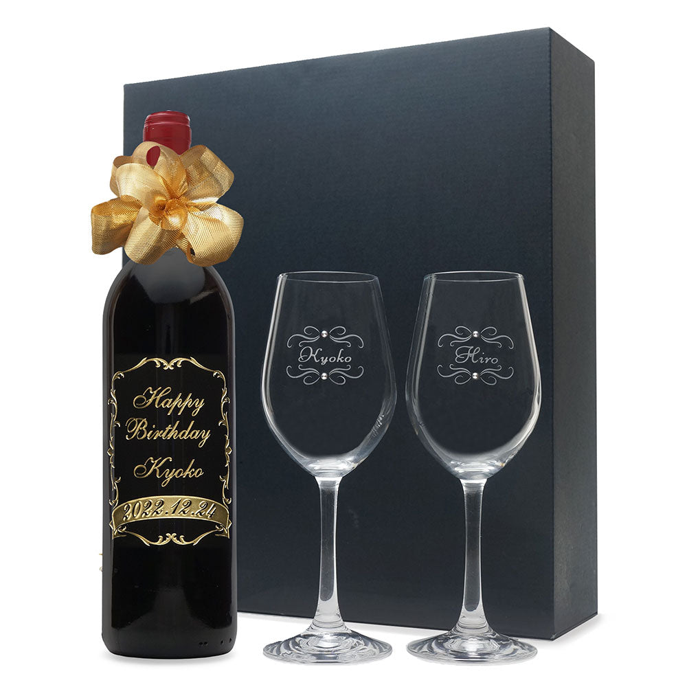 ボトルにメッセージ・名前・日付とワイングラスには名前を彫刻して唯一無二のオーダーメイドのオリジナルギフトを制作します。