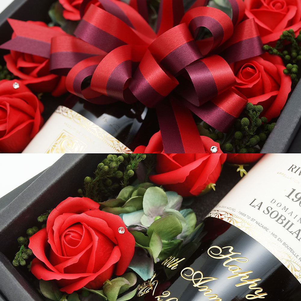特別なワインと赤いバラが調和するギフトボックス。