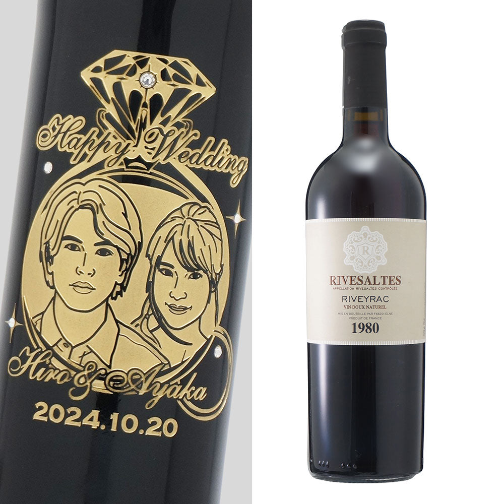 1980年に収穫されたブドウで作られた生まれ年ワインに、お名前やメッセージだけでなく、贈る方の似顔絵を彫刻することで、その人だけの特別な贈り物に仕上げます。