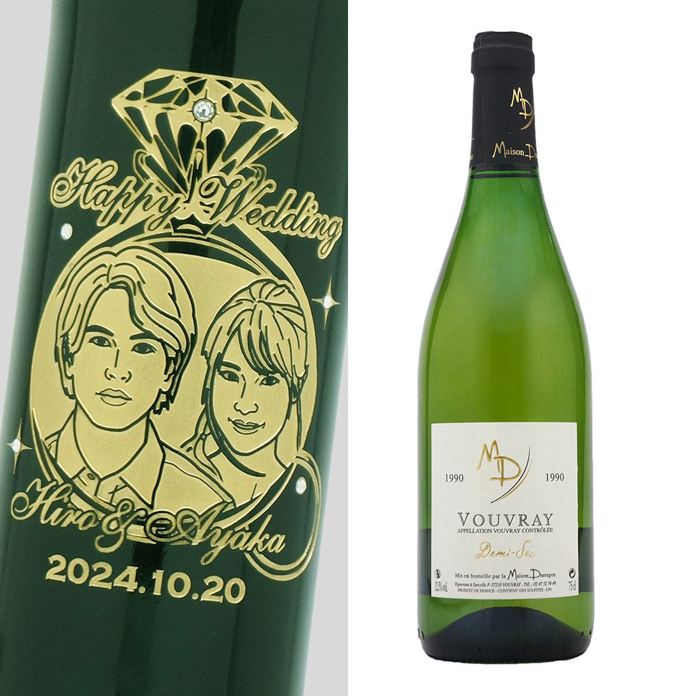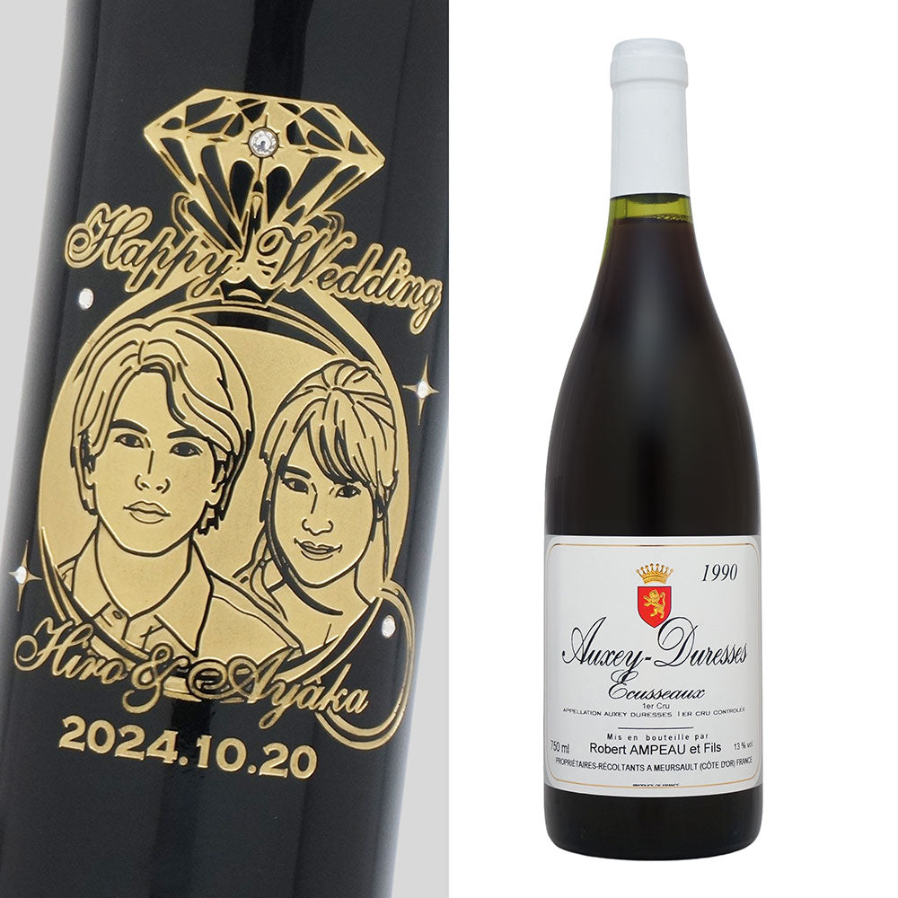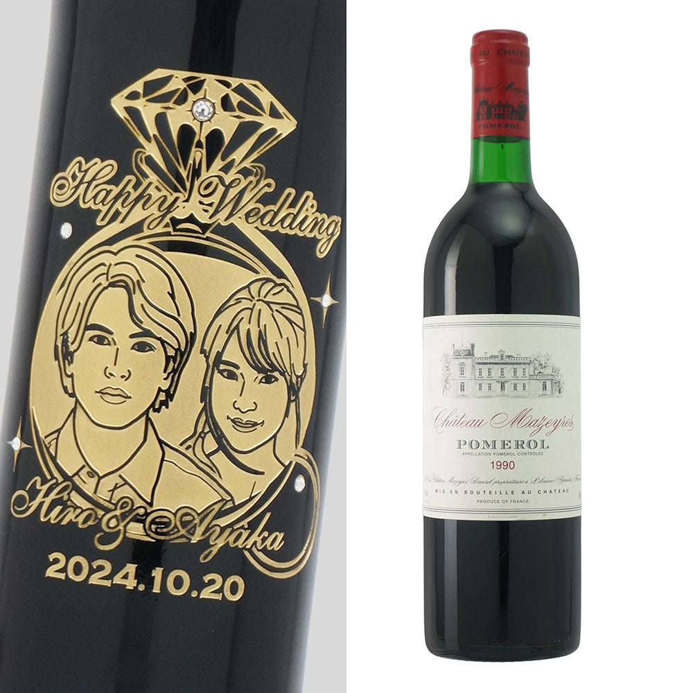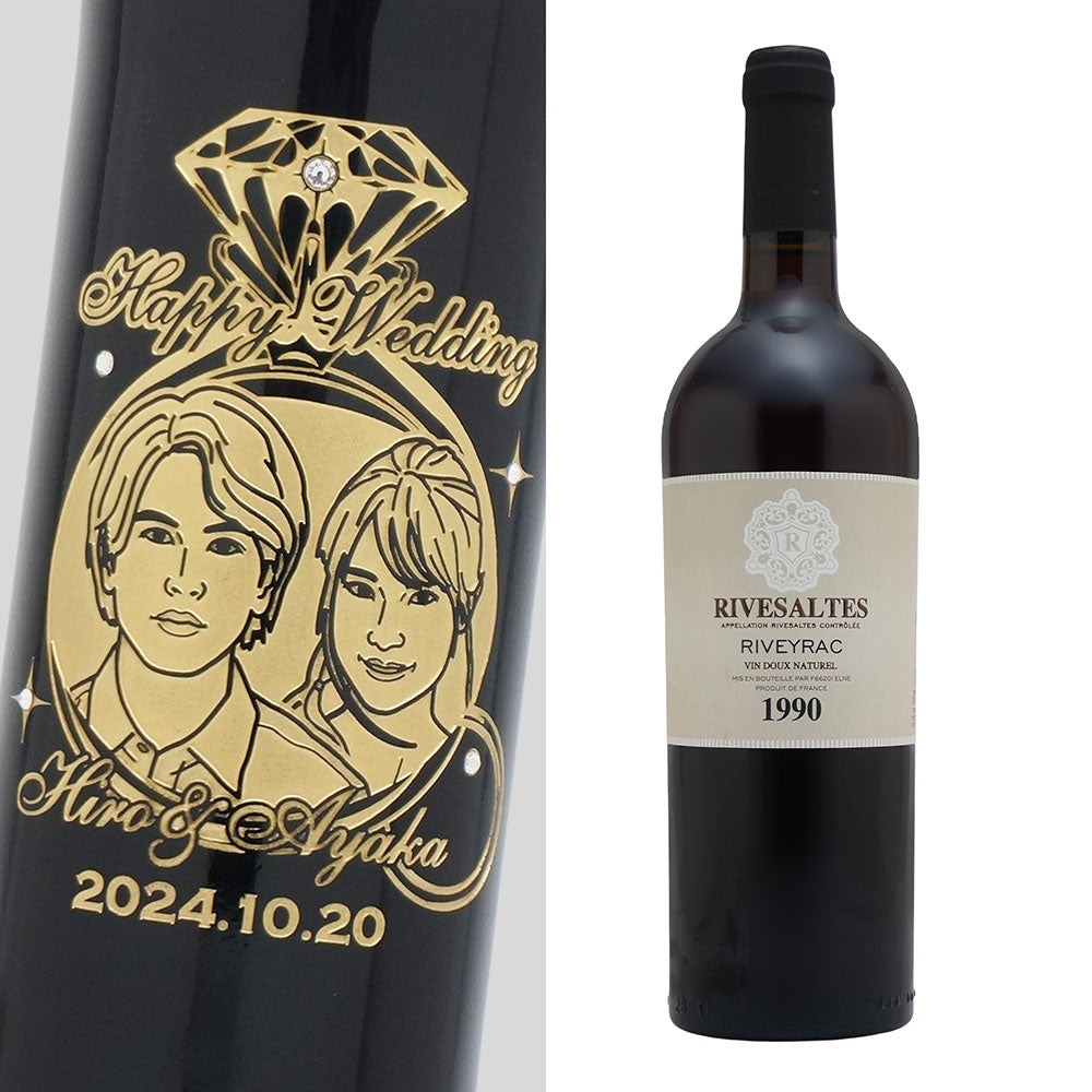 1990年に収穫されたブドウで作られた生まれ年ワインに、お名前やメッセージだけでなく、贈る方の似顔絵を彫刻することで、その人だけの特別な贈り物に仕上げます。