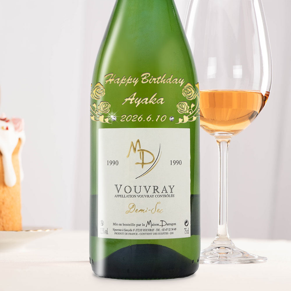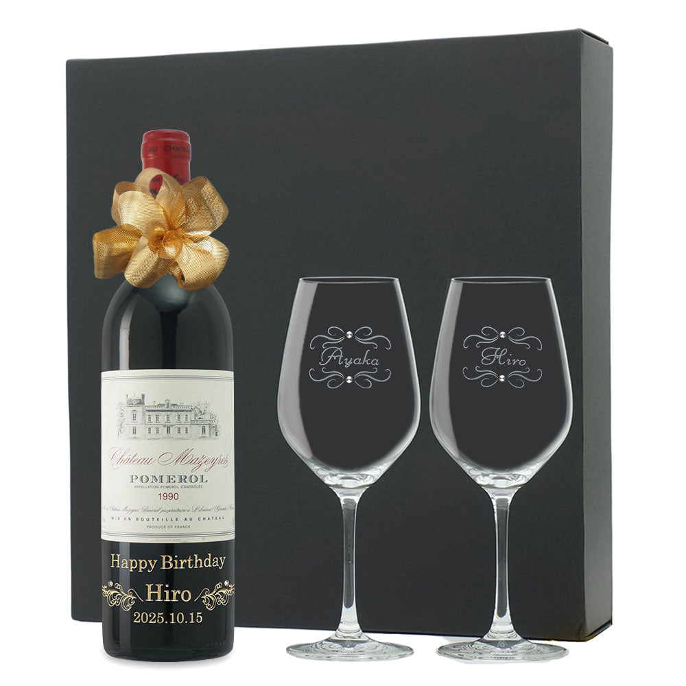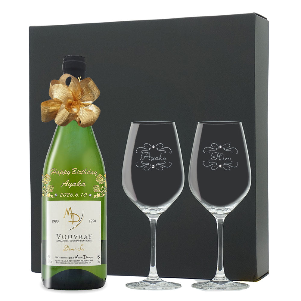 1990年に収穫されたブドウで作られた生まれ年ワインに、名前やメッセージを彫刻し、ペアグラスとともに贈るオーダーメイドギフト。心に残る、感動のプレゼントです。