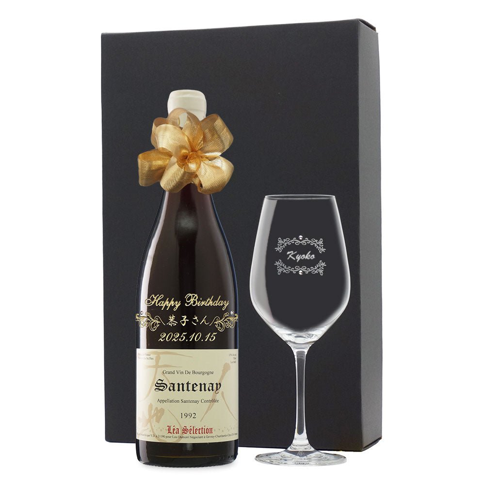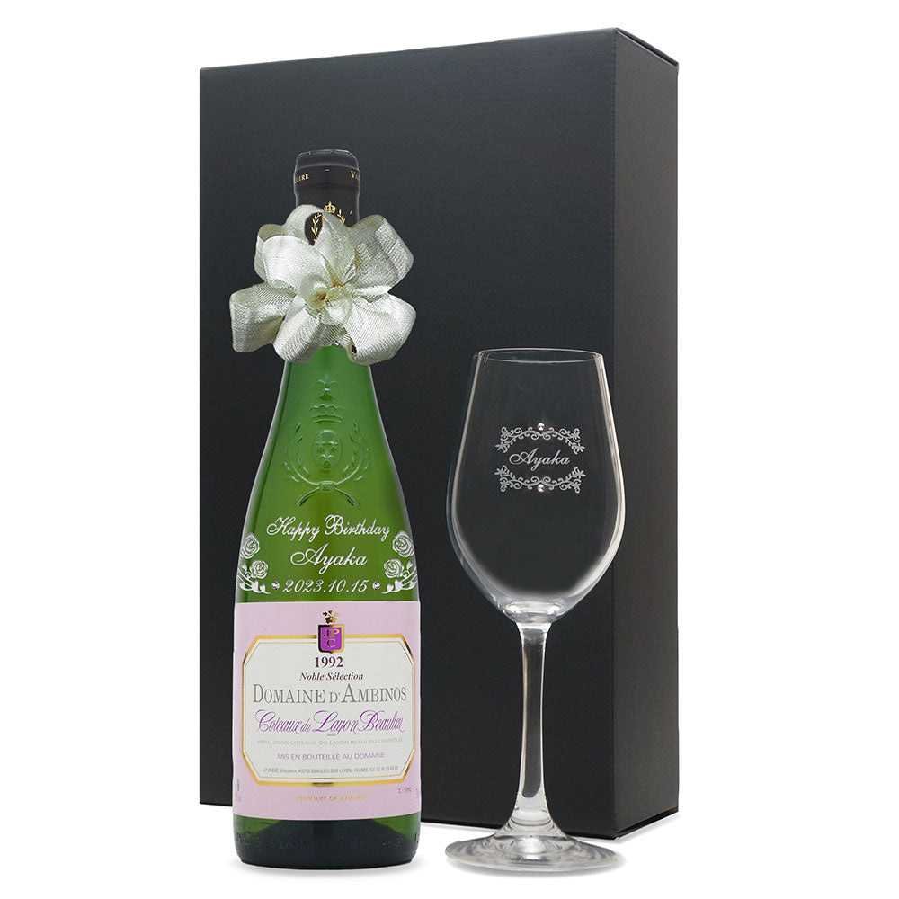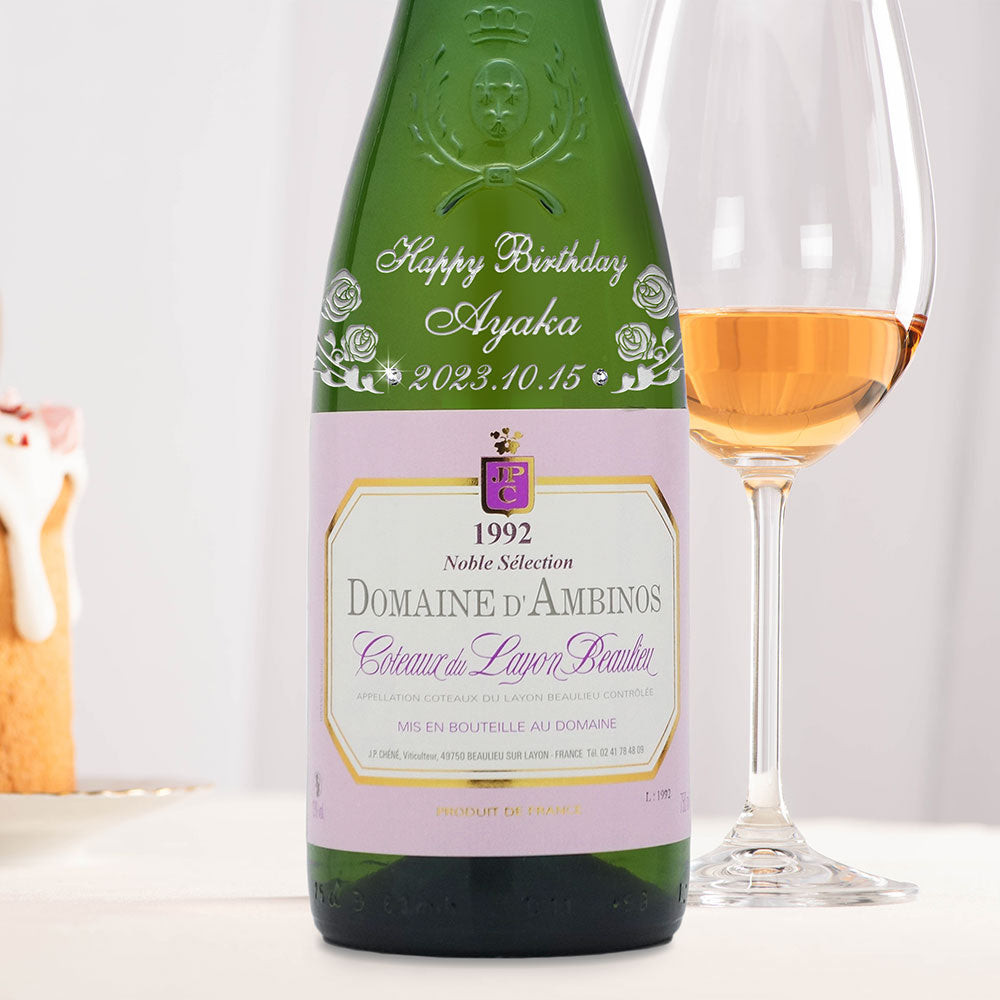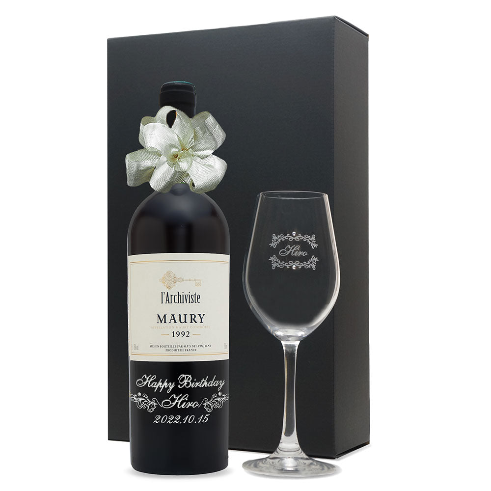 1992年に収穫されたブドウで作られた生まれ年ワインに、名前やメッセージを彫刻し、ワイングラスとともに贈る特別なオーダーメイドギフト。