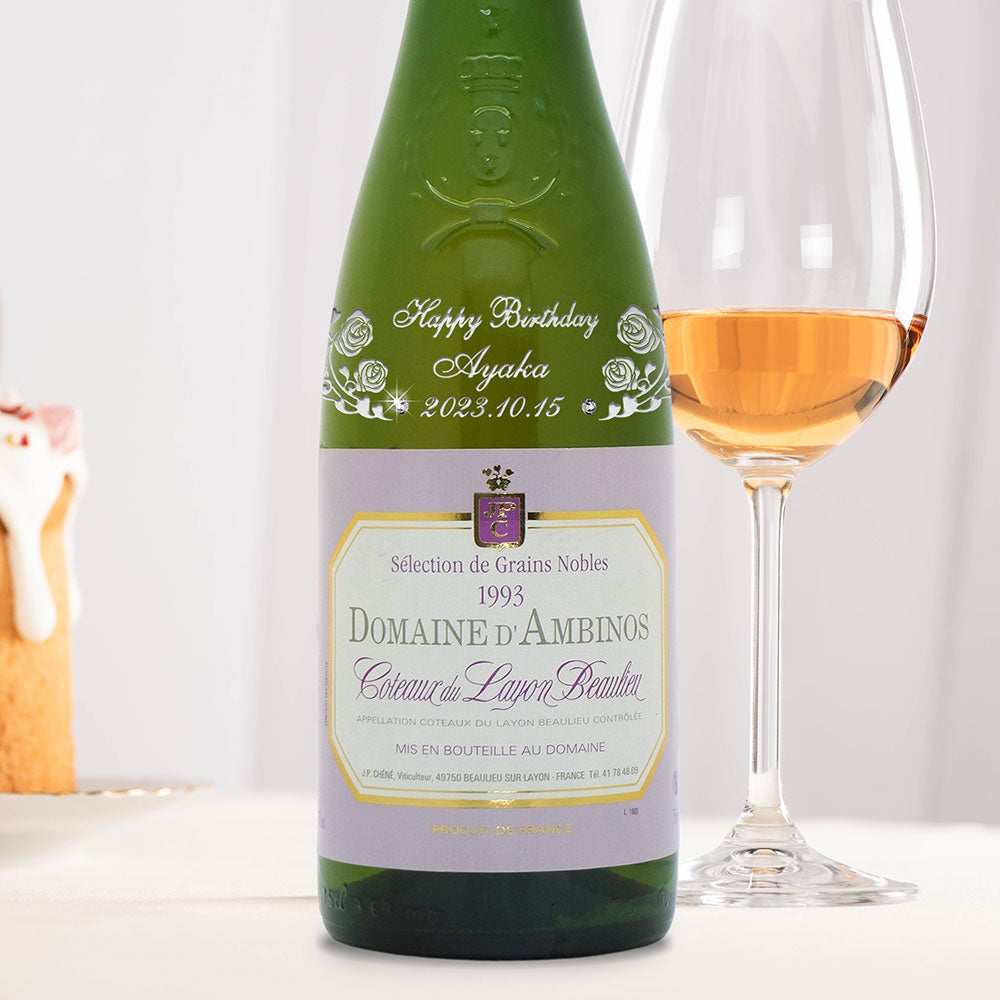 1993年に収穫されたブドウで作られた生まれ年ワインに、名前やメッセージを彫刻し、ワイングラスとともに贈る特別なオーダーメイドギフト。誕生日や記念日に、大切な方への感動を演出します。