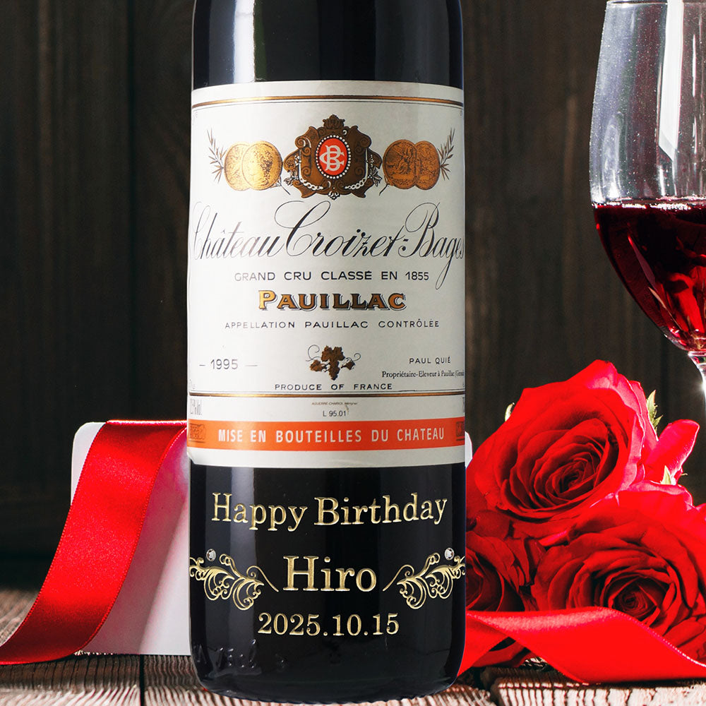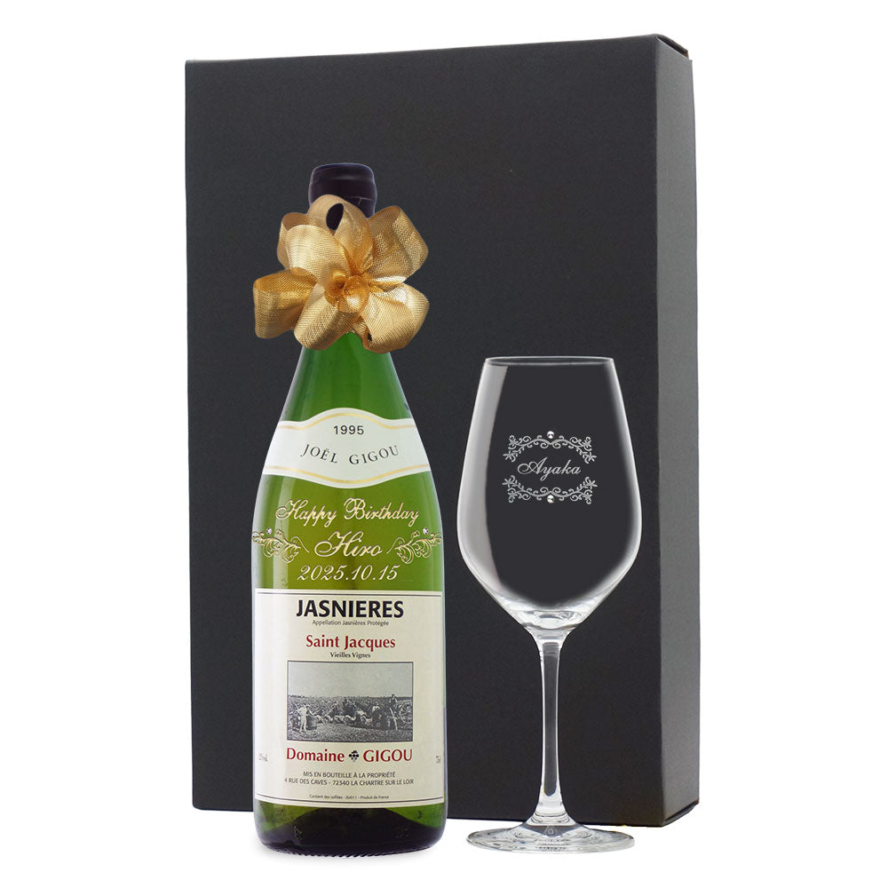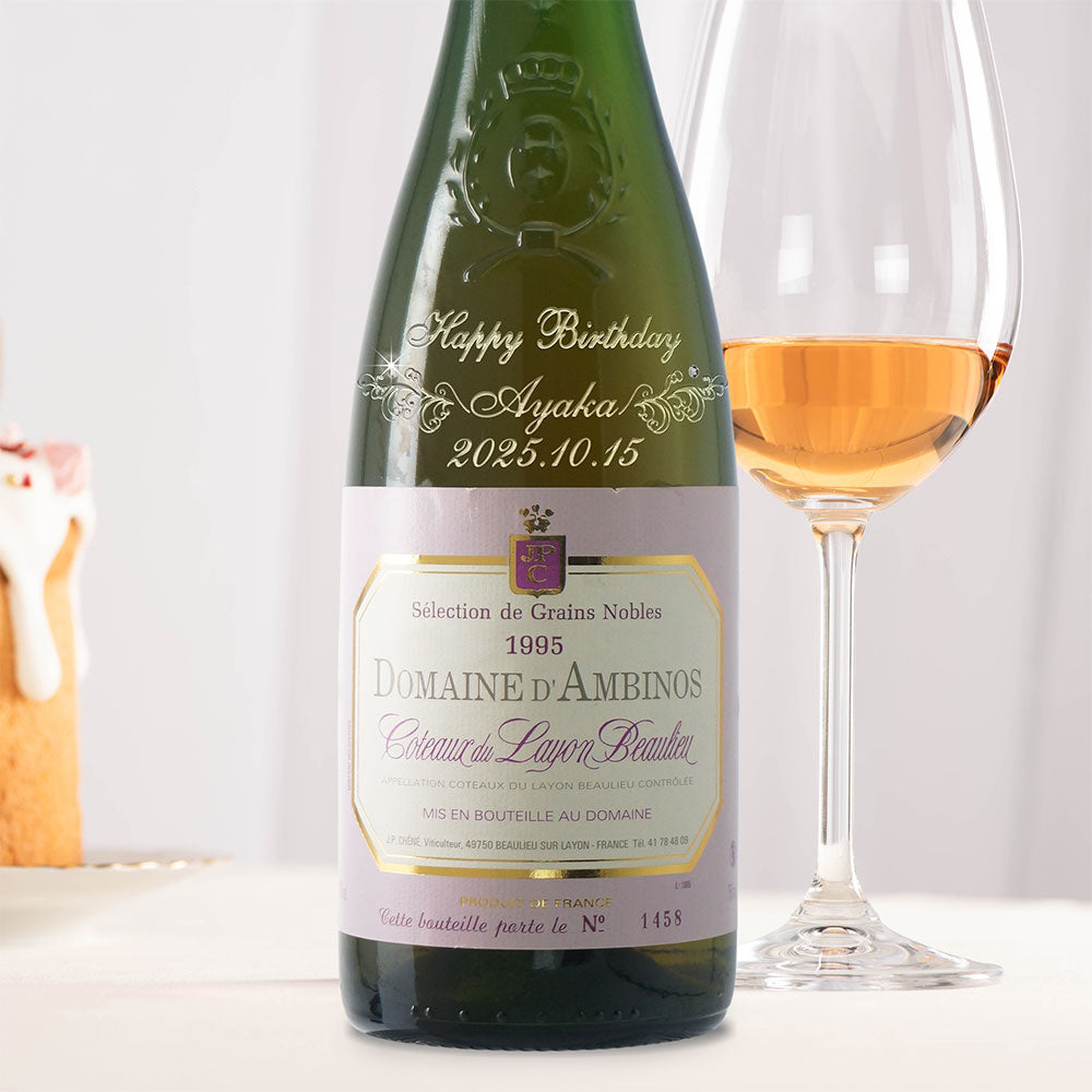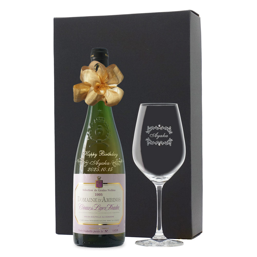 1995年に収穫されたブドウで作られた生まれ年ワインに、名前やメッセージを彫刻し、ワイングラスとともに贈る特別なオーダーメイドギフト。誕生日や記念日に、大切な方への感動を演出します。