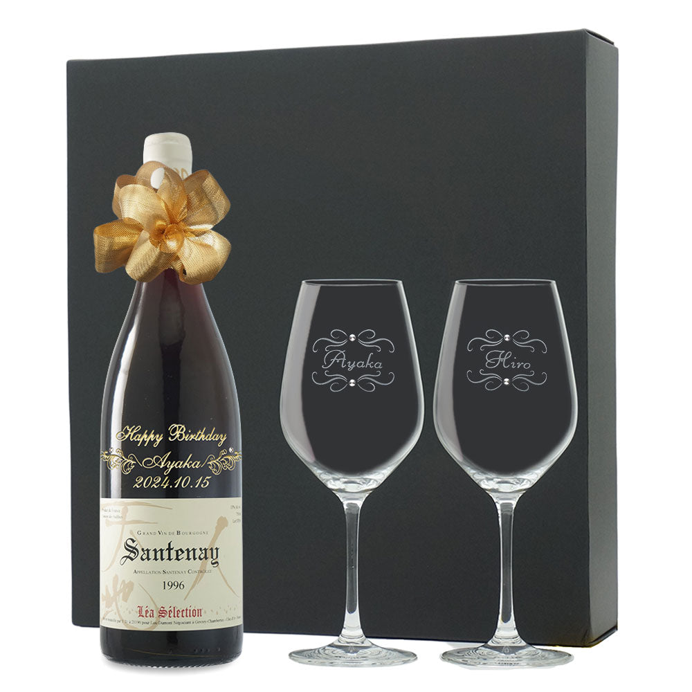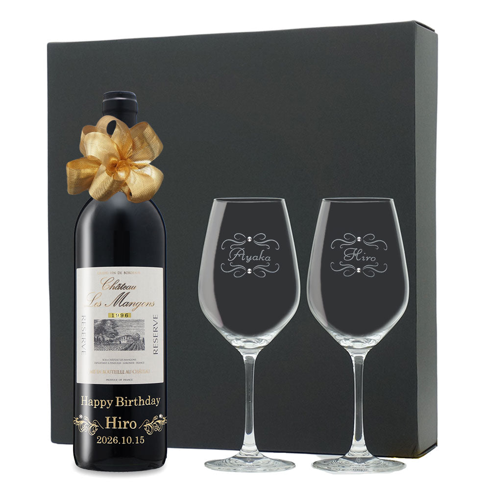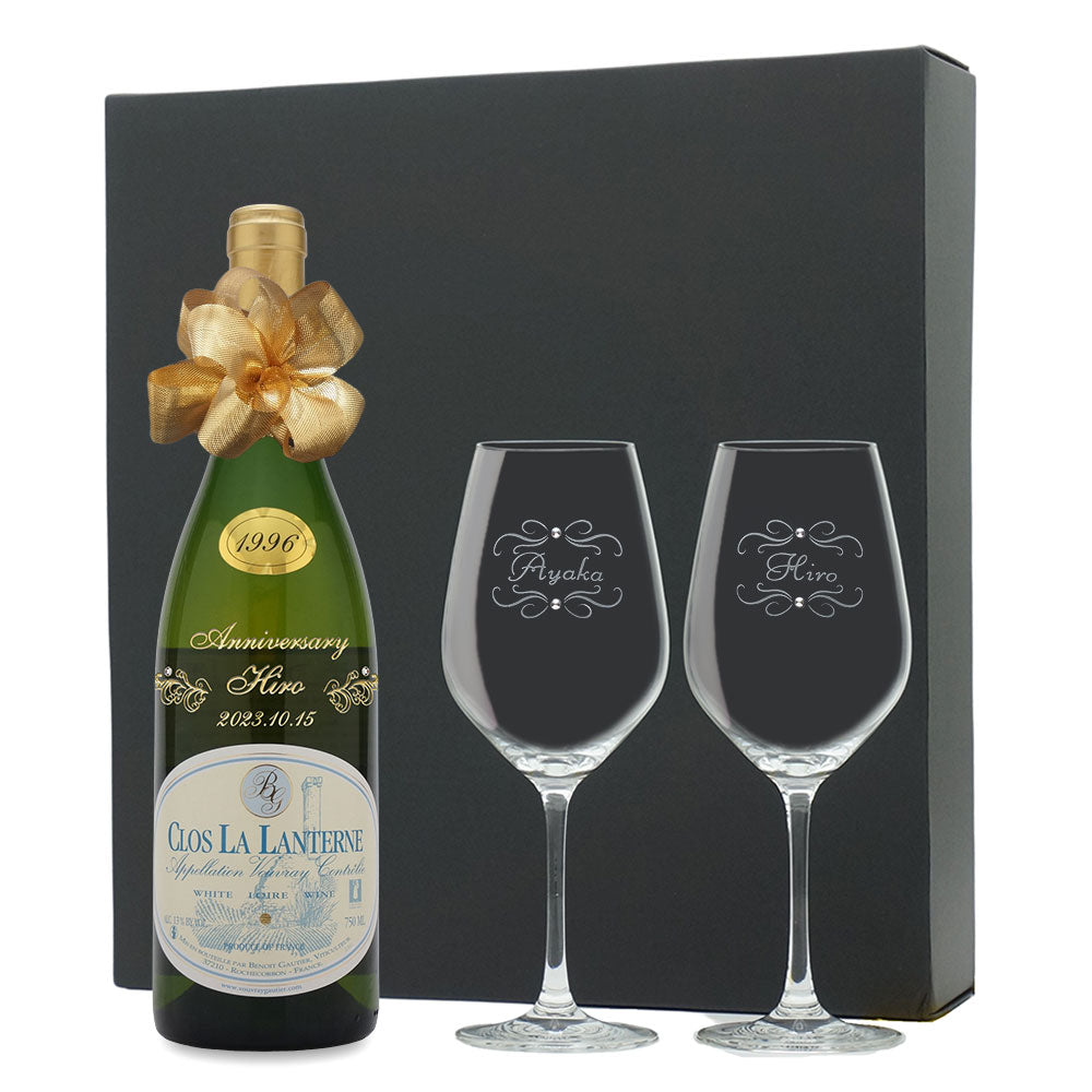 1996年に収穫されたブドウで作られた生まれ年ワインに、名前やメッセージを彫刻し、ペアグラスとともに贈るオーダーメイドギフト。心に残る、感動のプレゼントです。