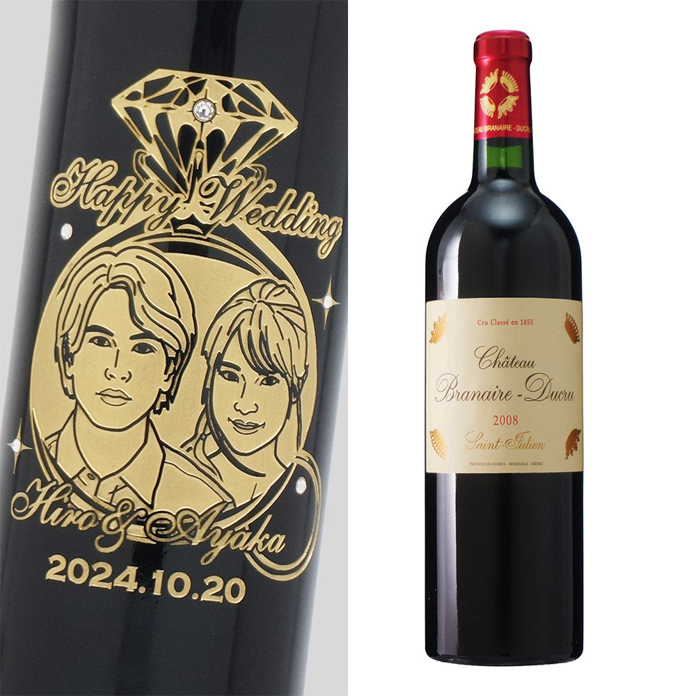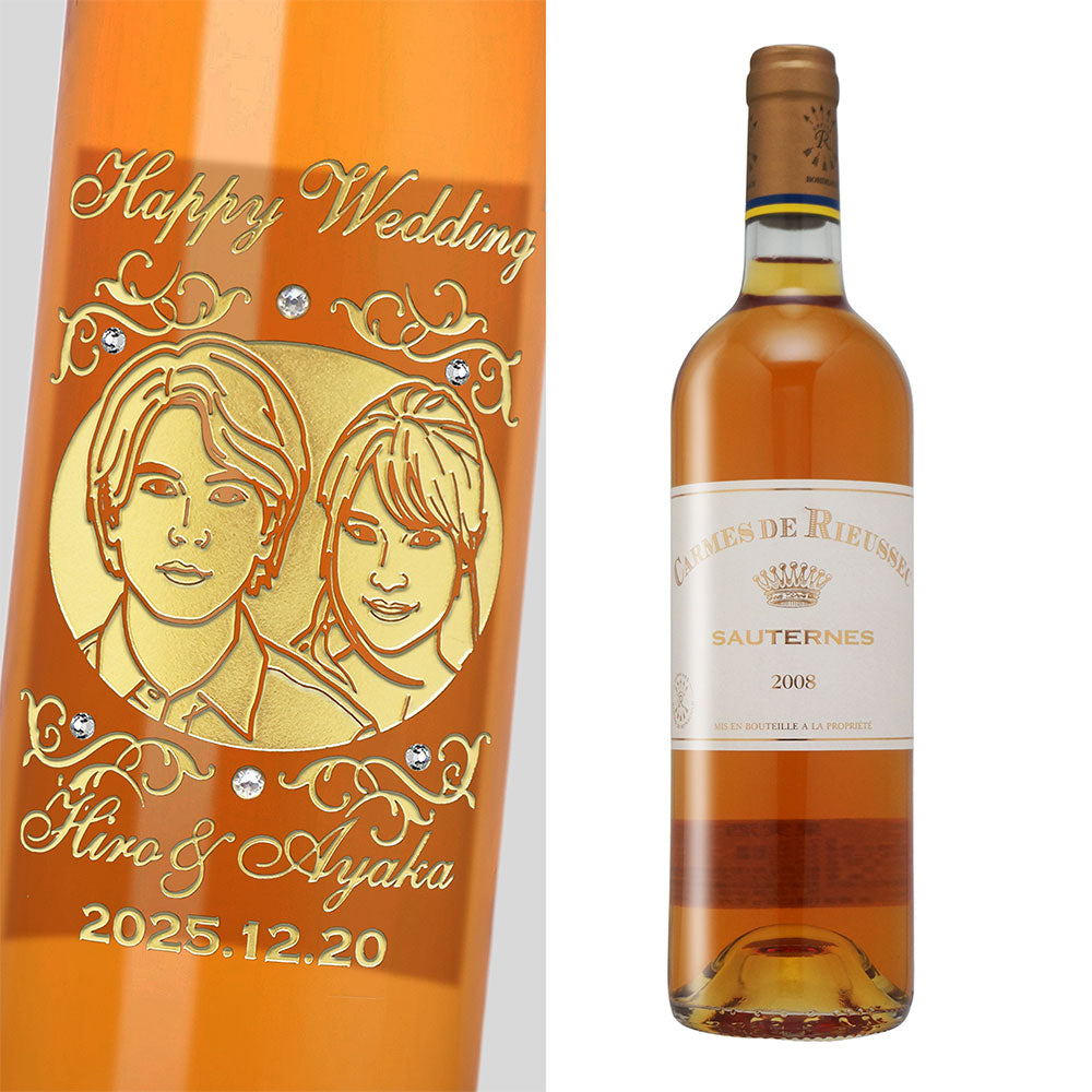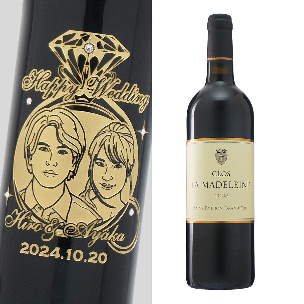 2008年に収穫されたブドウで作られた生まれ年ワインに、お名前やメッセージだけでなく、贈る方の似顔絵を彫刻することで、その人だけの特別な贈り物に仕上げます。