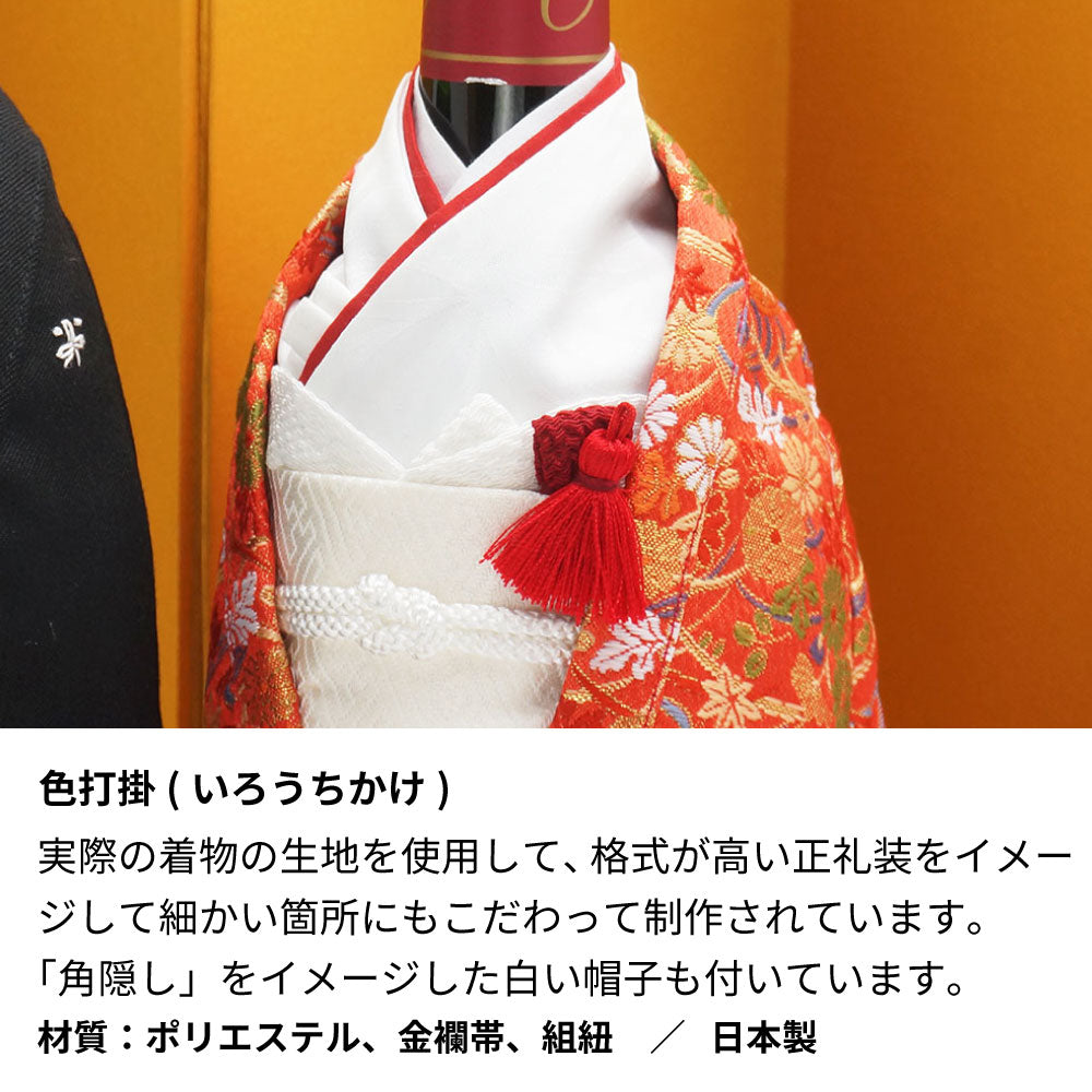 神戸ワインを美しい和装婚礼の着物で飾った特別な贈り物をです。この和装ワインボトルは、結婚祝いのプレゼント、結婚式のウェルカムボトルとしてご利用いただけます。