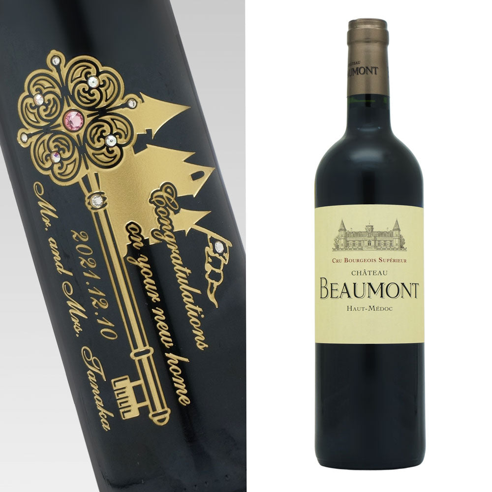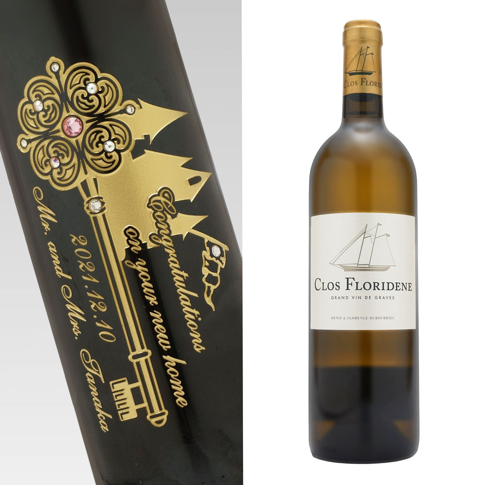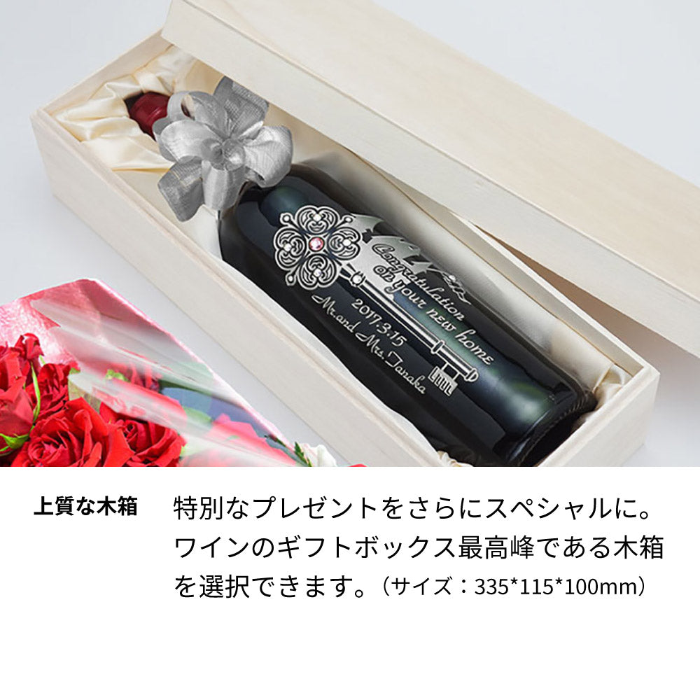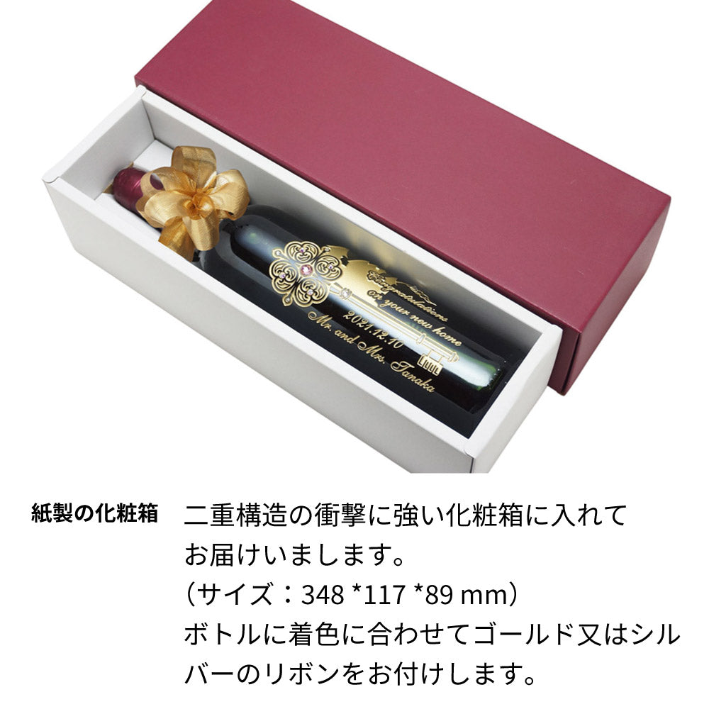 当ショップ厳選のお手頃価格の赤ワイン又は白ワインに、新築祝いデザインと名前、オリジナルメッセージを彫刻、ラインストーンをデコレーションした特別な贈りものです。