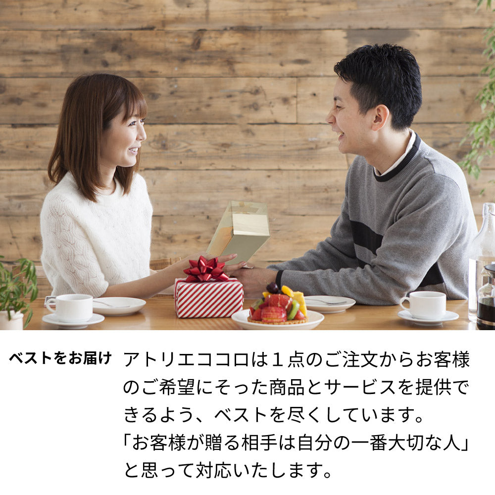 アトリエココロさんとは顔が見えないやり取りでしたが、一つ一つの対応が丁寧で安心できました。ホームページにある通り、「お客様が贈る相手は自分の一番大切な人と思って対応いたします」が見事に実現されているように感じ、アトリエココロさんには感謝しかありません。